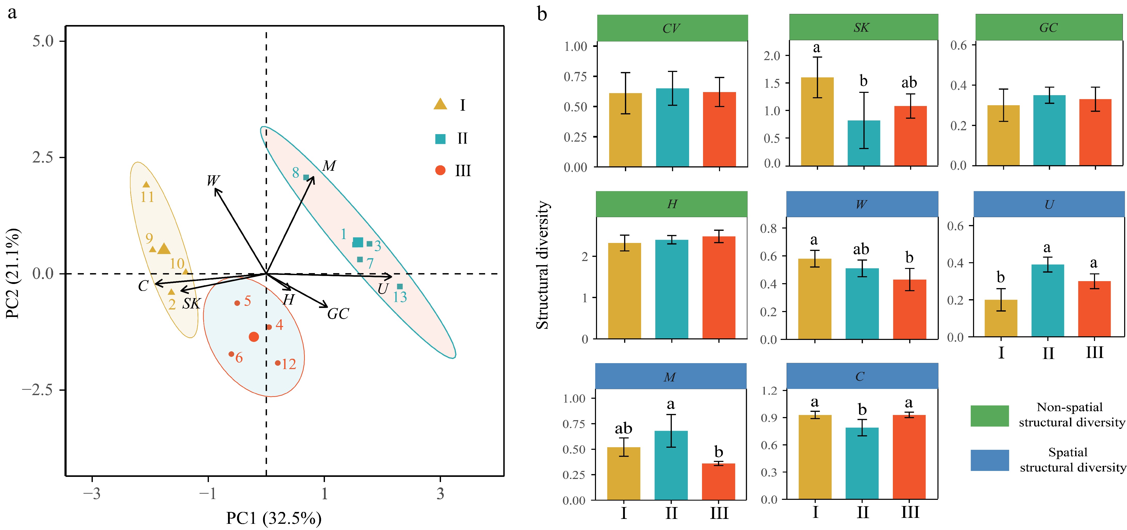 PCA analysis results for (a) forest type classification, and (b) differences in spatial and non-spatial structural diversity among forest types.