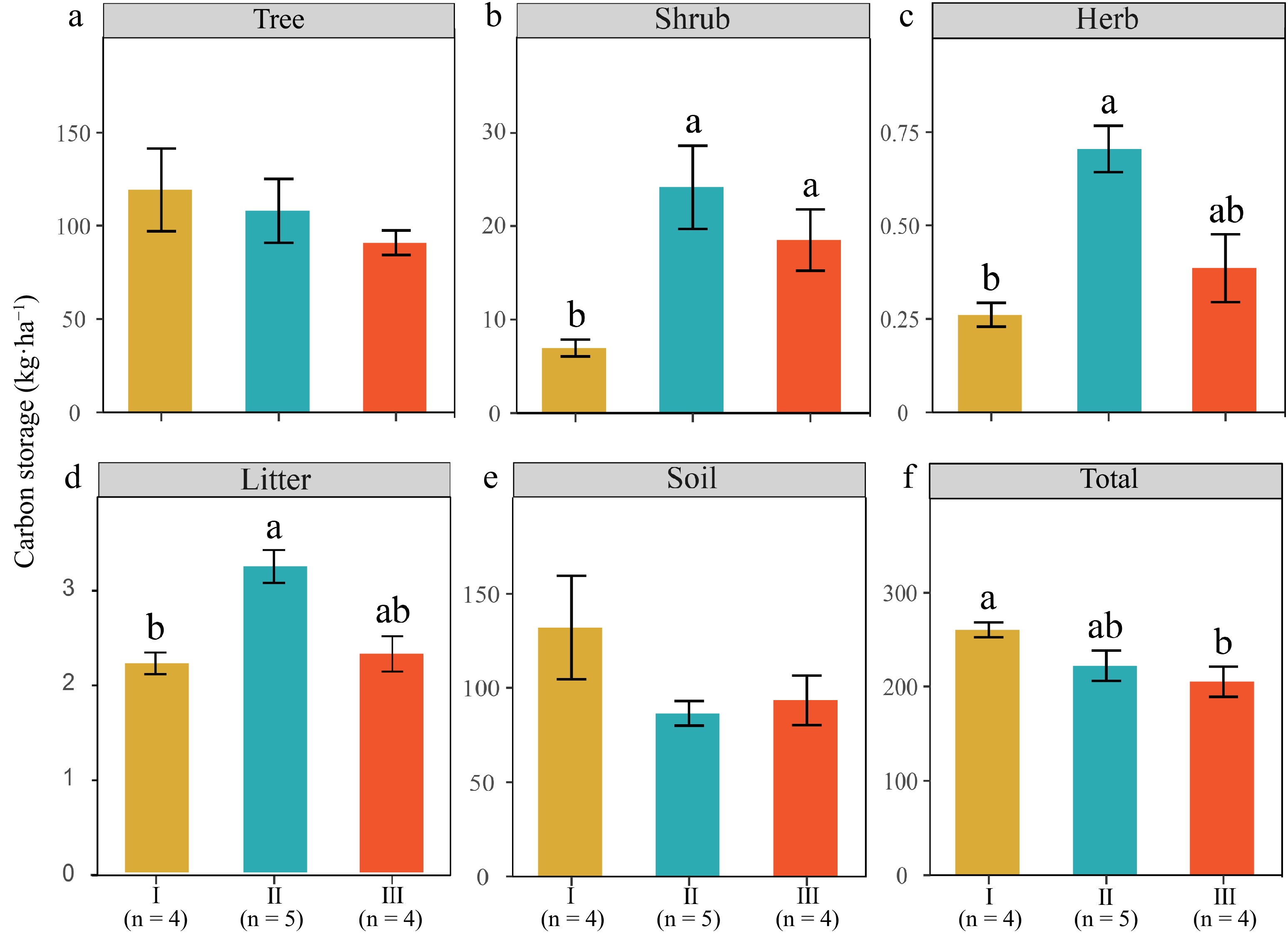 • The total carbon storage of Type I was significantly greater than that of type III (p < 0.05) (Fig. 2a). No significant differences were observed in carbon storage between the tree and soil layers; however, the Type I exhibited the highest levels (Fig. 2b, f). Conversely, the carbon storage in the shrub, herb, and litter layers layer of Type I was significantly lower compared to Type II and Type III (p < 0.05, Fig. 3c). The percent of carbon storage in overstory, understory, and soil layers can be seen in Supplementary Fig. S1.