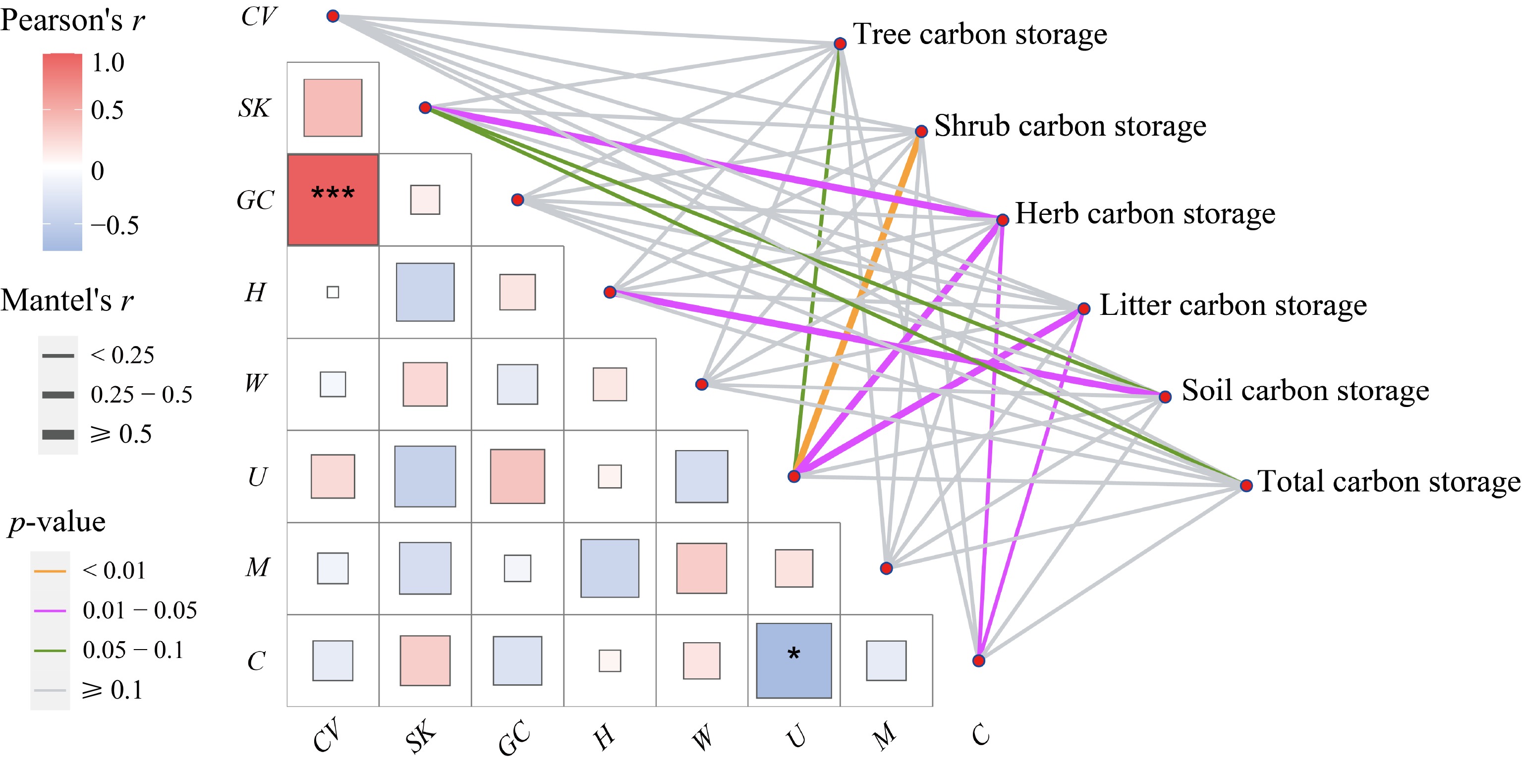 • The Mantel test elucidated the relationships between carbon storage, stand spatial, and non-spatial structural diversity (Fig. 3). SK and U indexes were the primary factors influencing carbon storage. In particular, total carbon storage was influenced by the SK index, while carbon storage in the tree, shrub, herb, and litter layers was influenced by the U index. Additionally, carbon storage in the herb and litter layers was also affected by crowding. The CV index was positively correlated with the GC index (p < 0.001), and the U index was negatively correlated with the crowding index (p < 0.05).