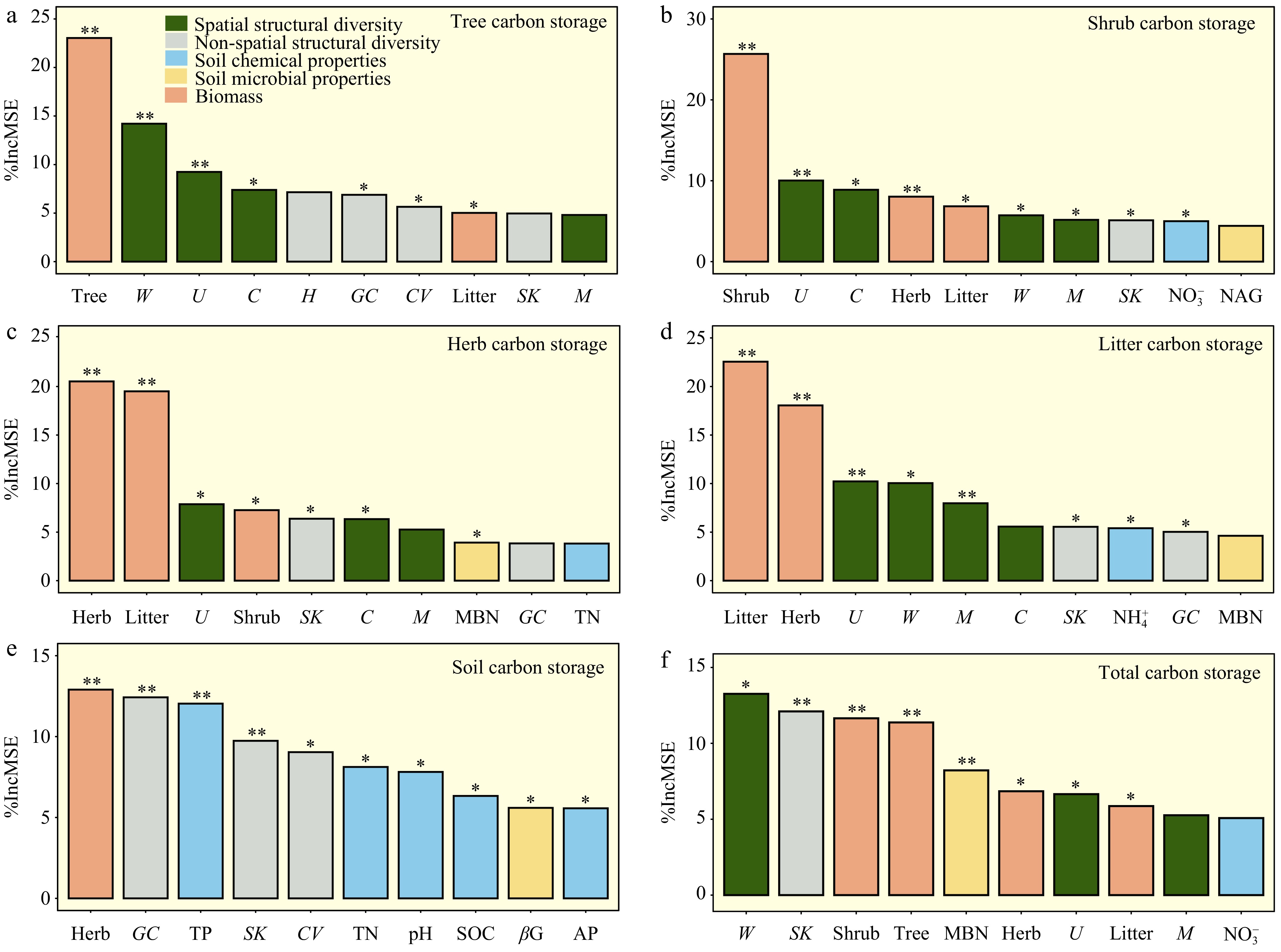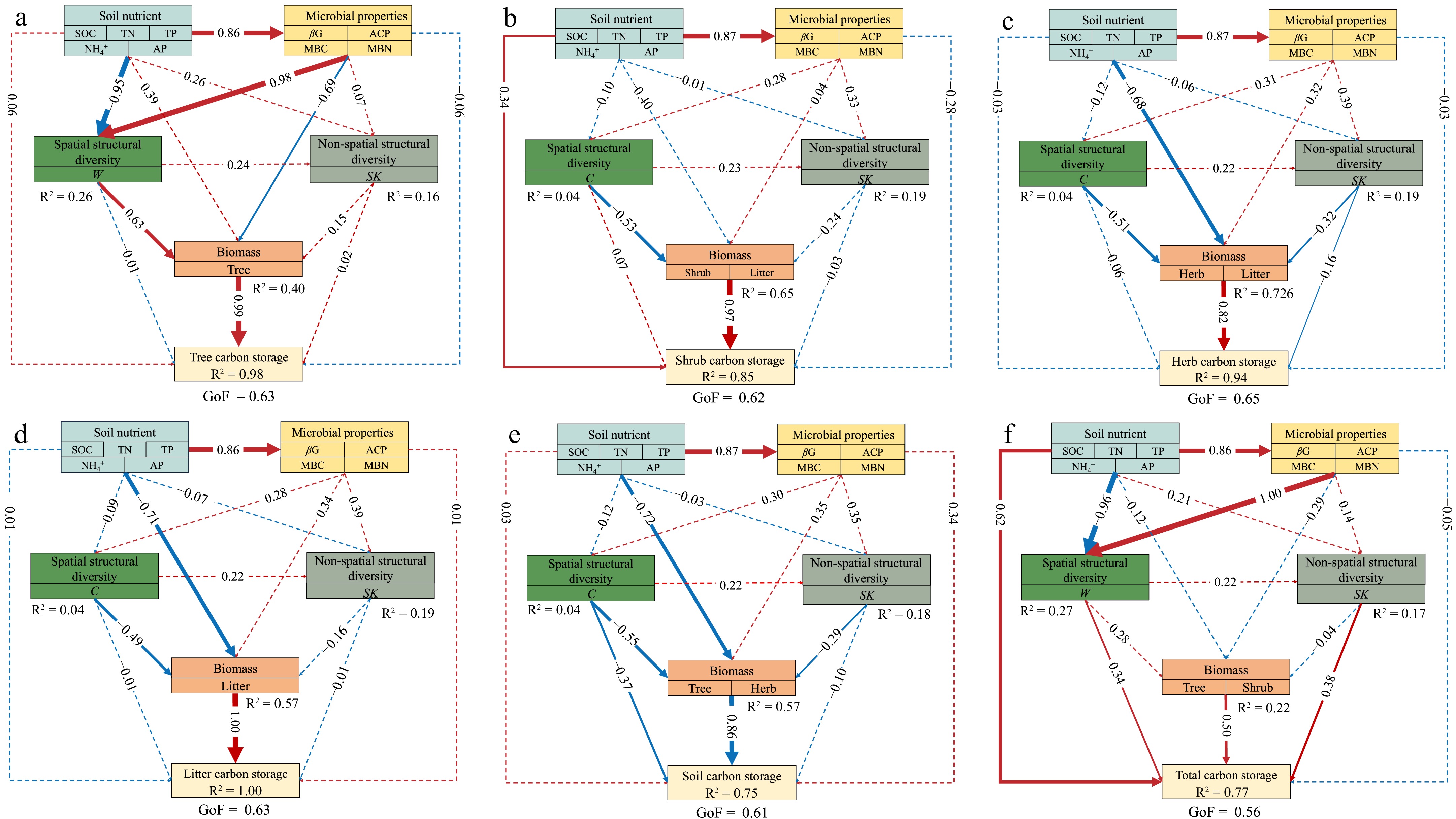 • The random forest analysis further revealed that total carbon storage was most influenced by biomass and stand structural diversity (Fig. 4a). Tree carbon storage was mostly affected by stand spatial and non-spatial structural diversity, with tree biomass showing the highest contributions (Fig. 4b). Carbon storage in shrub, herb, and litter layers is primarily determined by biomass, and is also influenced by stand spatial structural diversity (Fig. 4ce). Soil carbon storage is primarily influenced by stand non-spatial structural diversity and soil chemical properties (Fig. 4f).