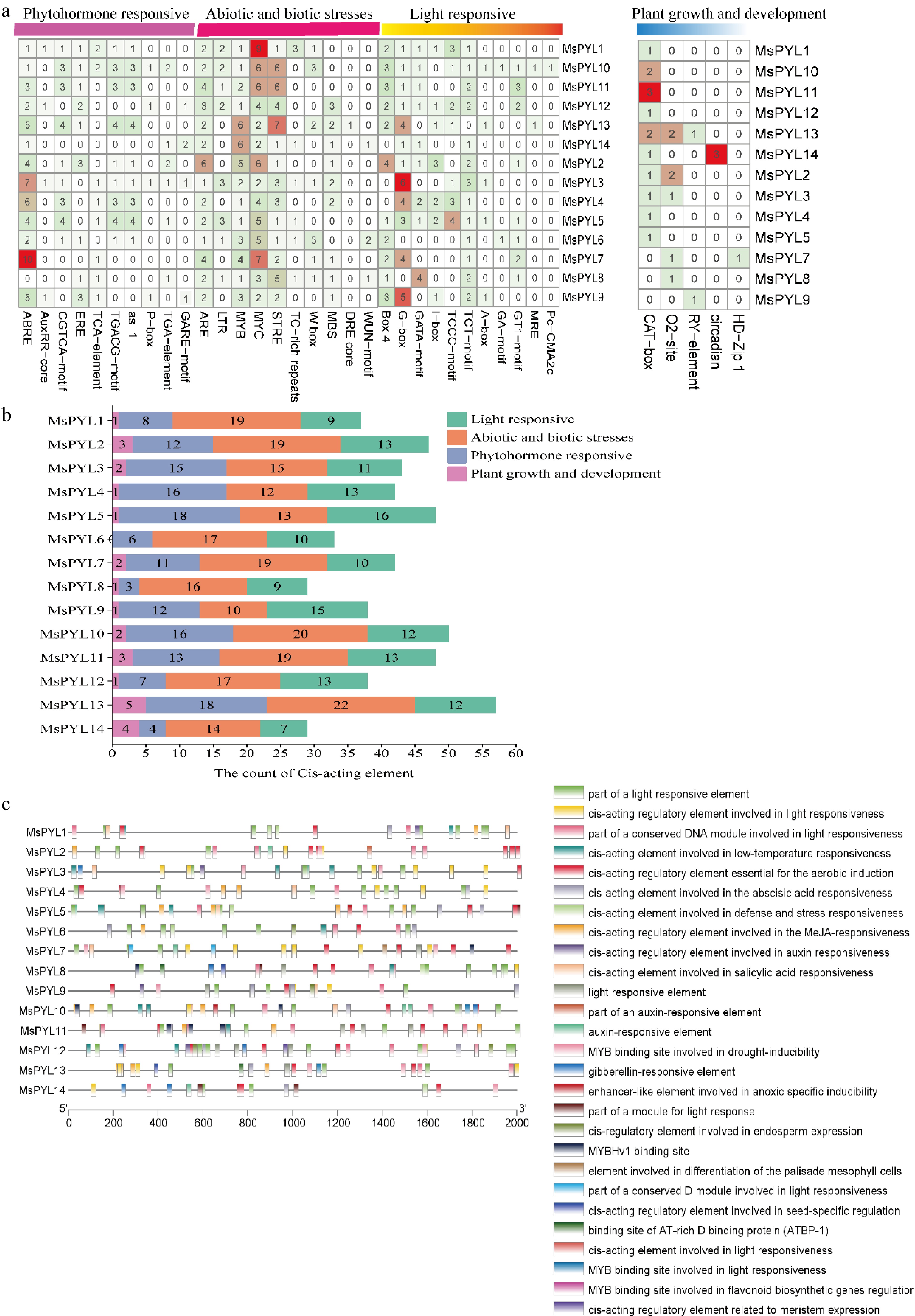 Cis-acting elements on the promoter of the MsPYL gene. (a) Four types of cis-acting elements. (b) Statistics of the total number of cis-acting elements. (c) Distribution of cis-acting elements: different colour modules on the right represent different cis-acting elements. ABRE, ABA responsive motif; TGACG motif, and CGTCA motif, MeJA responsive motif.