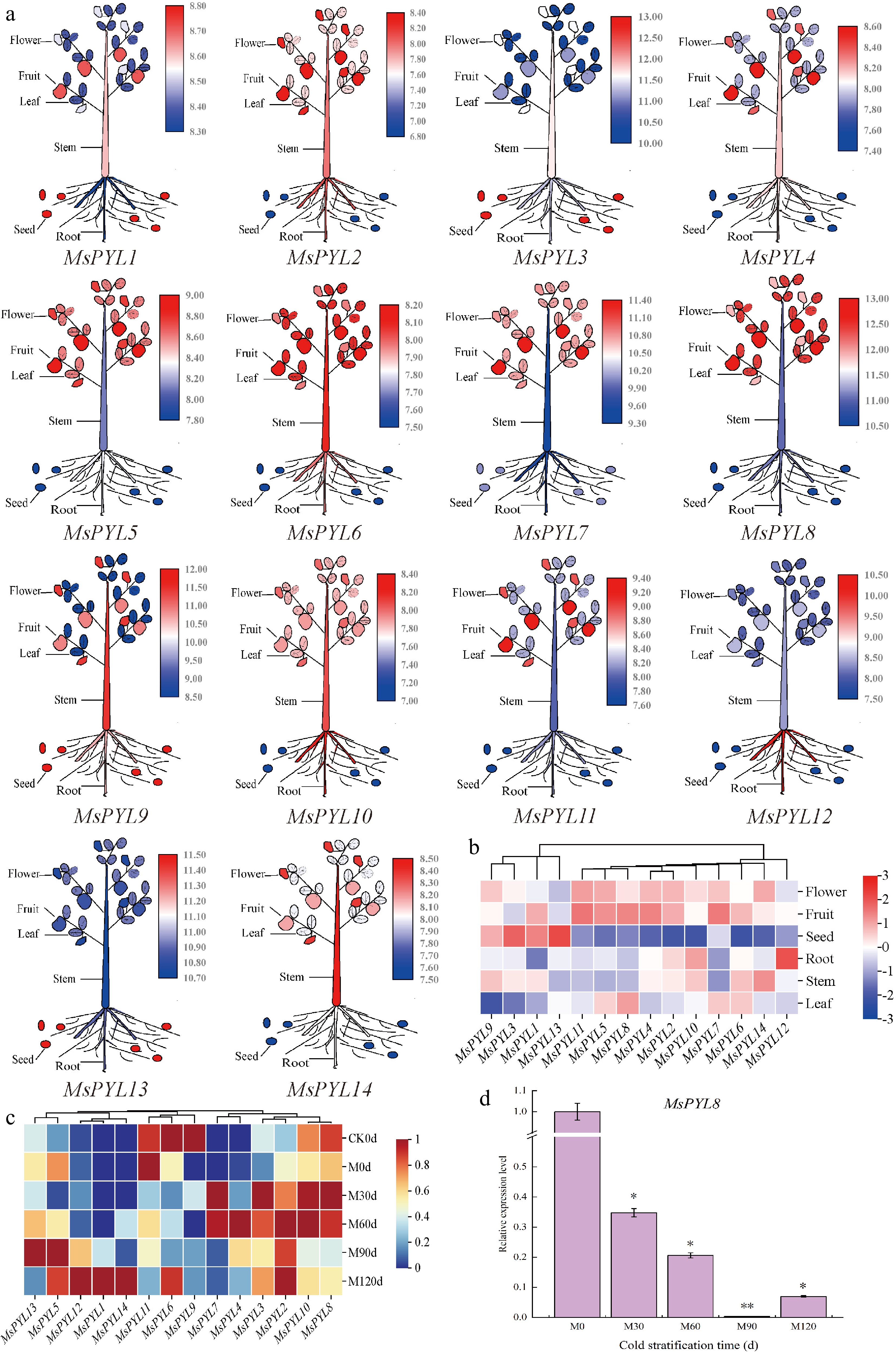 PYL gene expression in Malus sieversii. (a) The expression pattern of the Malus sieversii PYL gene in six organs (seeds, roots, stems, leaves, mature fruits, and flowers) is shown in the form of a cartoon diagram of plant simulation. Red colour indicates high expression and blue colour indicates low expression. (b) Heat map showing the expression of PYL gene in six organs. (c) Heatmap demonstrating the expression pattern of PYL genes in seeds at different periods of low-temperature stratification. (d) MsPYL8 was analyzed by qRT-PCR. Error lines indicate standard deviation, and the values in the graphs are the mean ± standard deviation (SD) of three independent biological replicates. Student's t-test asterisks indicate significant up- or down-regulation of the MsPYL8 compared to the un-stratified treatment (* p < 0.05, ** p < 0.01).