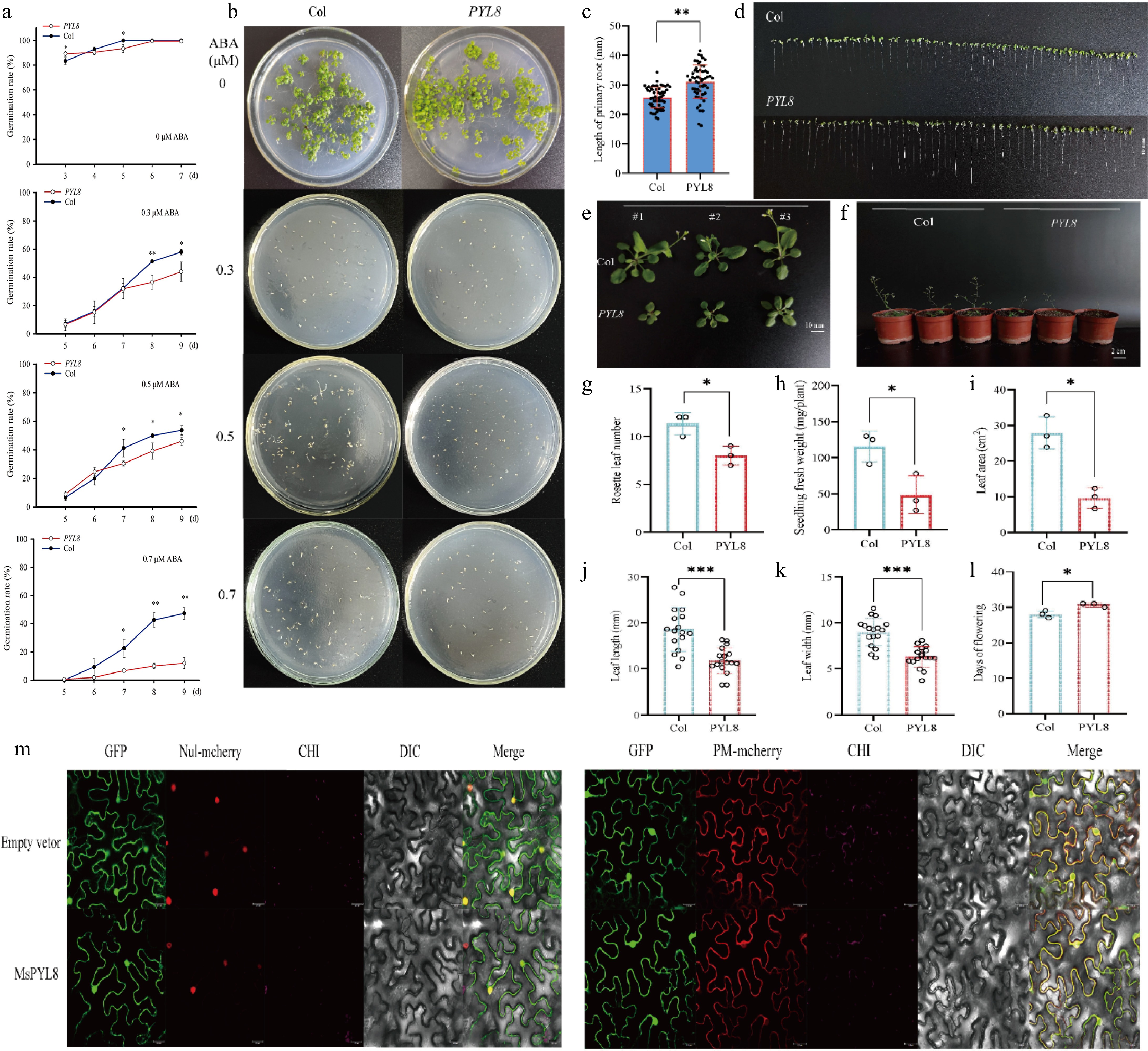 PYL8 functional validation and PYL8 subcellular localization. (a) Germination rate measurement. Seeds of Col and PYL8 strains were seeded on Murashige and Skoog (MS) medium containing different concentrations of ABA. Germination was defined as the emergence of embryo growth, with germination rates recorded daily until day 7 (for controls without ABA), or day 9 (for treatments with 0.3, 0.5, and 0.7 μM ABA). Data are means ± SD (n = 3), Student's t-test (* p < 0.05) (** p < 0.01). (b) Seed germination of PYL8 strain was inhibited by different concentrations of ABA. Col seeds were cultured on MS medium without ABA (control) for 7 d, and PYL8 seeds were cultured on MS medium containing different concentrations of ABA (0.3, 0.5, and 0.7 μM ABA) for 12 d. (c) Seven-day root length statistics of Col and PYL8 strains. Values are means ± SD (n = 56), Student's t-test (** p < 0.01). (d) Seven-day root length of Col and PYL8 strains. Scale bar represents 10 mm. (e) Phenotypic analysis of 28-d Col, PYL8 strains. Col, PYL8 transgenic plants that sprouted and grew on MS medium at 7 d of age were transferred to nutrient soil and continued to grow for 21 d. Scale bar = 10 mm. (f) Flowering phenotypes of 35-d Col, PYL8 strains. (g) Statistical analysis of Arabidopsis rosette leaves. Data are means ± SD (n = 3), Student's t-test (* p < 0.05). (h) Statistical analysis of fresh weight of plant above-ground parts. Data are means ± SD (n = 3), Student's t-test (* p < 0.05). (i) Statistical analysis of total plant leaf area. Data are presented as mean ± SD (n = 3), Student's t-test (* p < 0.05). (j) Statistical analysis of plant leaf length. Data are presented as mean ± SD (n = 17), Student's t-test (*** p < 0.001). (k) Statistical analysis of plant leaf width. Data are presented as mean ± SD (n = 17), Student's t-test (*** p < 0.001). (l) Statistical analysis of plant flowering time. Data are presented as mean ± SD (n = 3), Student's t-test (* p < 0.05). (m) Subcellular localization of MsPYL8 protein in N. benthamiana leaves. Scale bars = 25 μm.
