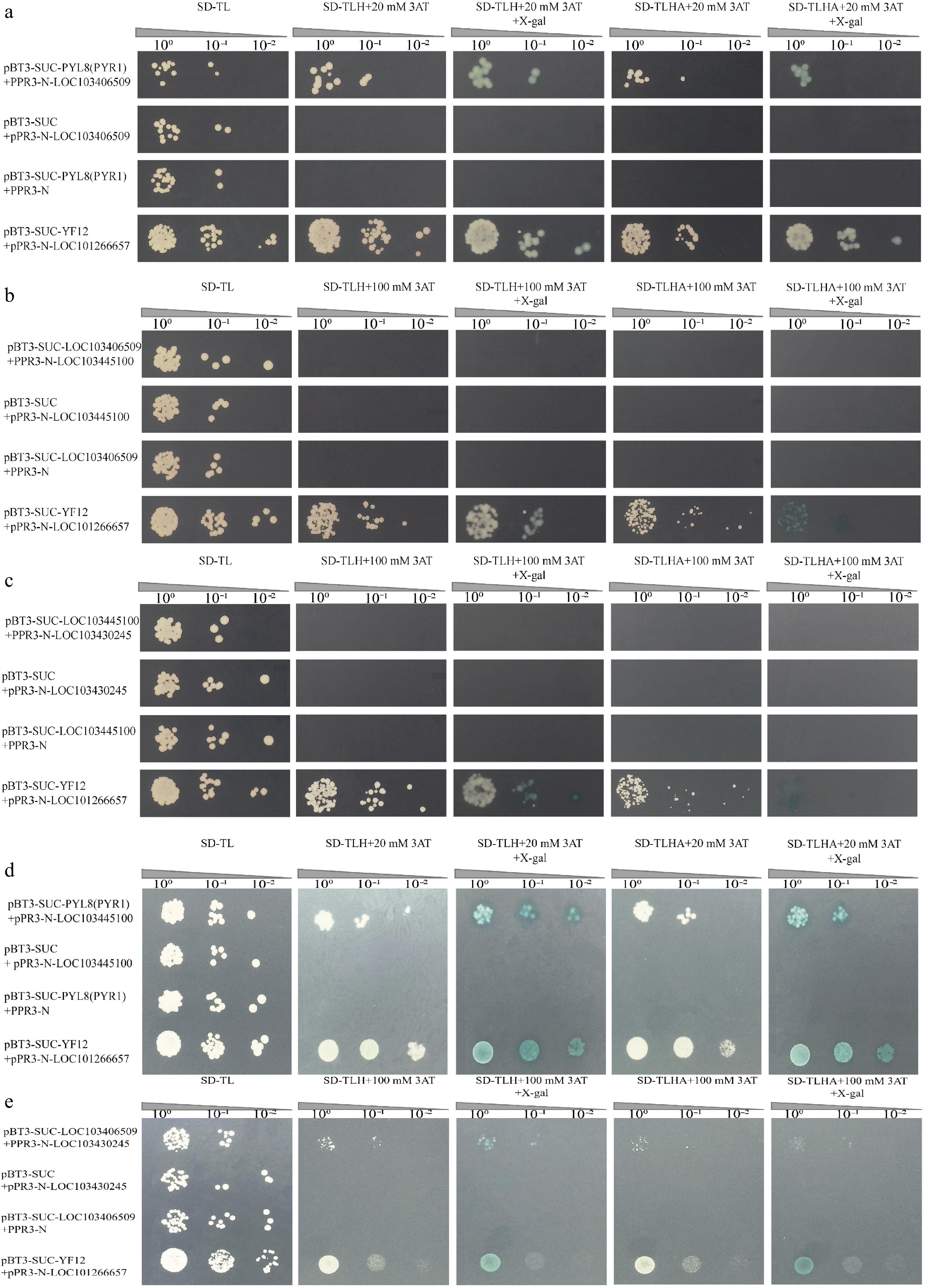 Point-to-point through Y2H assay of MsPYL8 interactions proteins. (a) Positive plasmids were tested with the Y2H assay for point-to-point validation of MsPYL8-MsLTI. pBT3-SUC-PYL8(PYR1) + pPR3-N and pBT3-SUC-LOC103406509 + pPR3-N were the negative controls. (b) Point-to-point validation of the positive plasmid with MsLTI-MsLEA. pBT3-SUC-LOC103406509 + pPR3-N and pBT3-SUC-LOC103445100 + pPR3-N were as negative controls. (c) Point-to-point validation of positive plasmids with MsLEA-MsABI5. (d) Positive plasmids were tested with the Y2H assay for point-to-point validation of MsPYL8-MsLEA. pBT3-SUC-PYL8(PYR1) + pPR3-N and pBT3-SUC-LOC103445100 + pPR3-N were the negative controls. (e) Point-to-point validation of positive plasmids with MsLTI-MsABI5. pBT3-SUC + pPR3-N-LOC103406509, pBT3-SUC + pPR3-N-LOC103430245 were used as negative controls. Spotting dilution gradient was 100, 10−1, 10−2 from left to right. SD-TL is a SD/-Trp-Leu-deficient plate, SD-TLHA is a SD/-Trp-Leu-His-Ade-deficient plate, where X-gal was added to produce a blue colour.