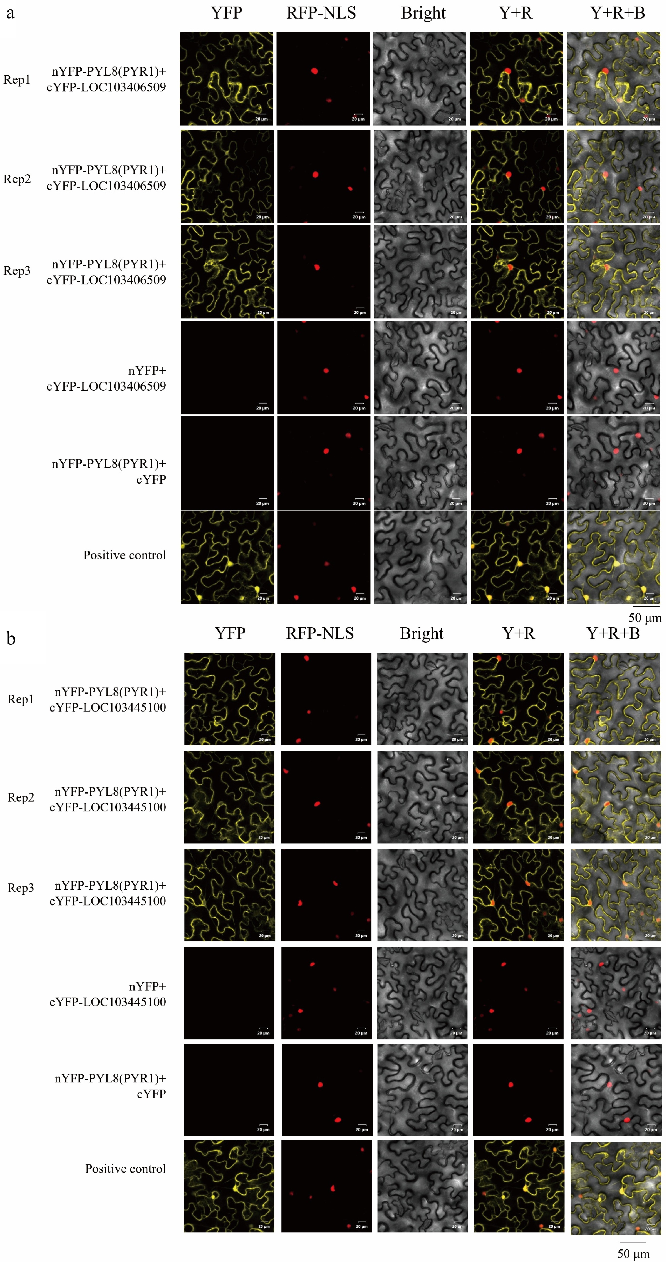 BiFC assay of MsPYL8 interactions proteins. (a) BiFC assay demonstrating the interactions of MsPYL8 with MsLTI at the nucleus and in the cytoplasm in tobacco leaves. (b) BiFC assay demonstrating the interactions of MsPYL8 with MsLEA at the cytoplasm in tobacco leaves. Scale bar = 20 μm.