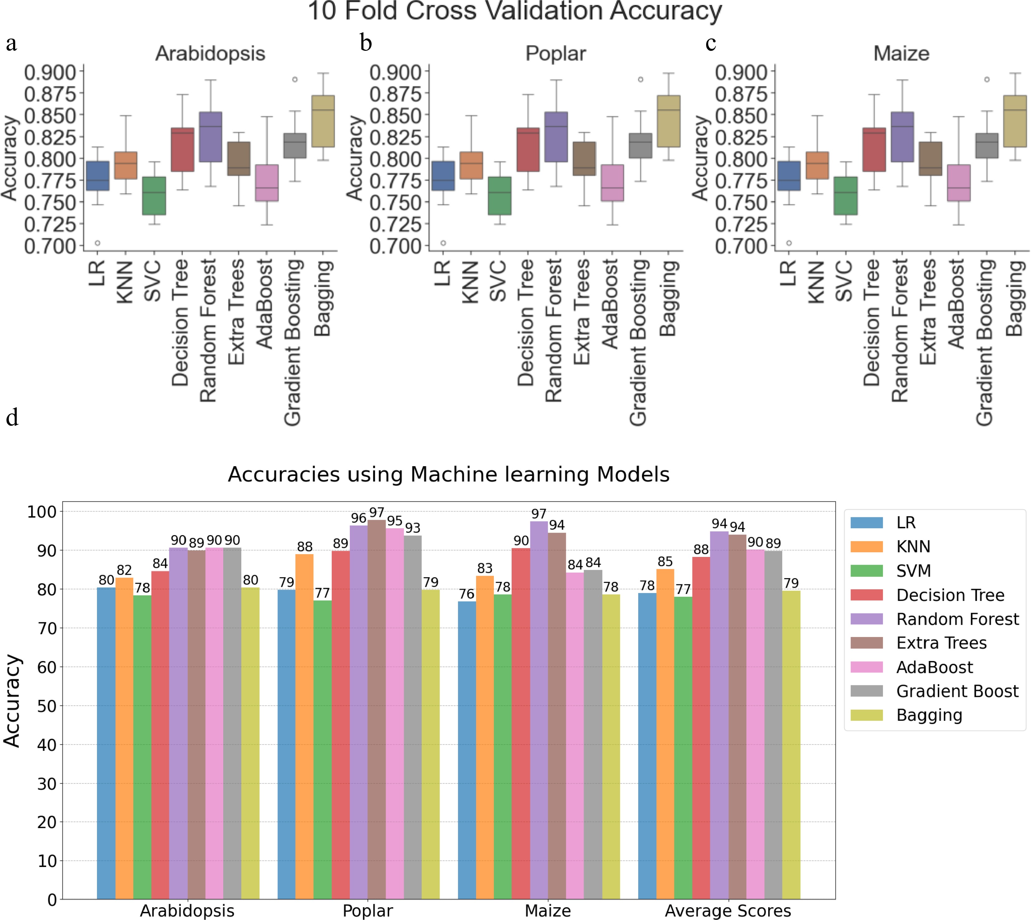 • After hybrid and plain models were trained and fine-tuned using the poplar and maize training data, we performed feature importance analysis using three hybrid models: the hybrid Random Forest, the hybrid Extremely Randomized Trees, and the hybrid AdaBoost models on the Poplar and Maize Transcriptomic Test Data Sets. For comparison, we also included their corresponding plain models and Spearman's rank correlation method. In this study, we highlighted two representative results: the hybrid Extremely Randomized Trees model on the poplar test set and the hybrid AdaBoost model on the Maize test set.