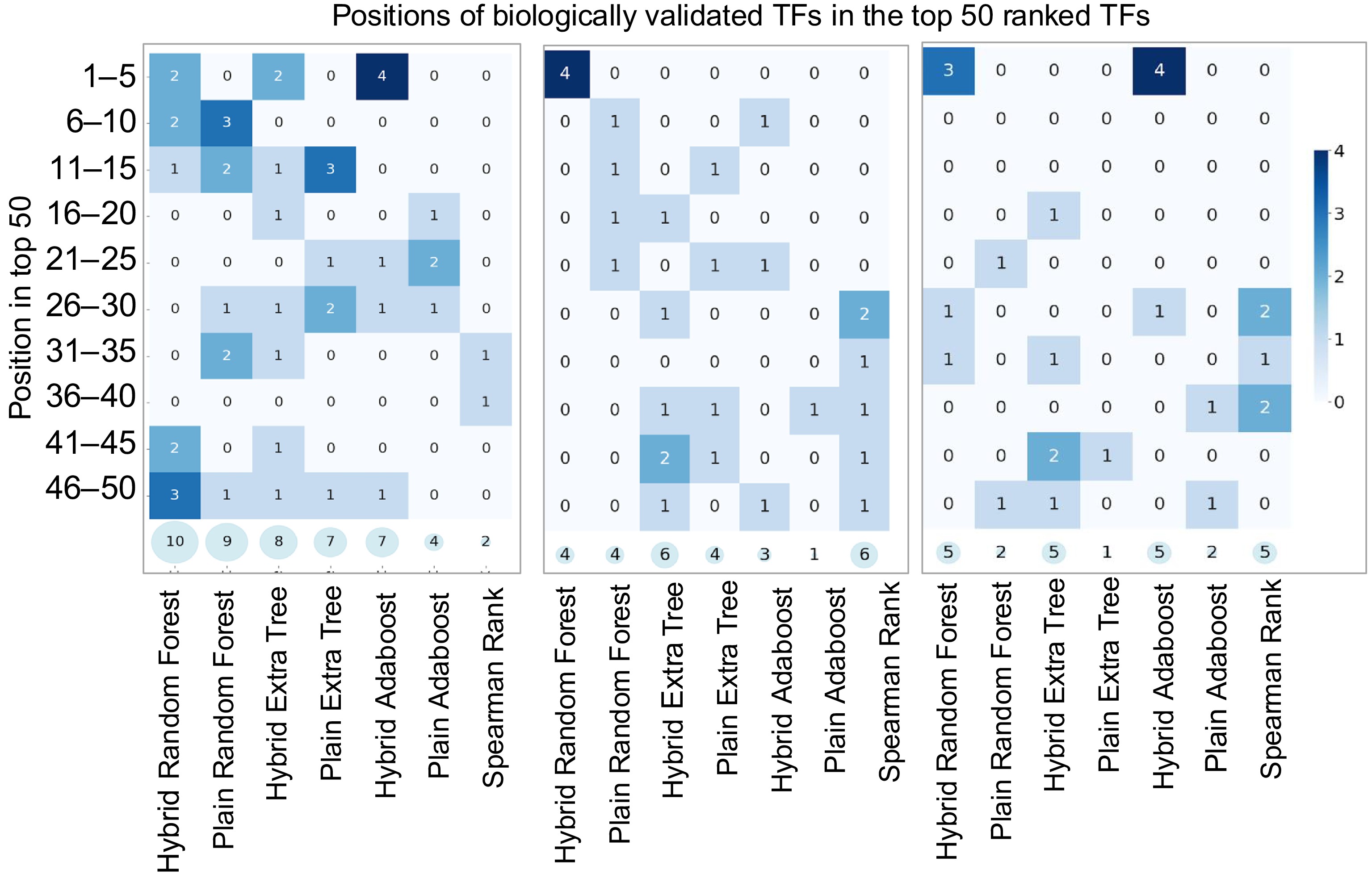 Using Arabidopsis Transcriptomic Test Data Set 1, and Poplar and Maize Transcriptomic Test Data Sets, we evaluated the performance of three hybrid Random Forest, hybrid Extremely Randomized Trees, and hybrid AdaBoost—against their corresponding plain versions in identifying known positive TFs regulating LBP. Spearman's rank correlation was also included as a baseline statistical method for comparison. We revealed the following facts: (1) The hybrid models not only identified a greater number of TFs but also consistently ranked them among the top candidates, highlighting their superior ability to prioritize biologically relevant regulators. (2) Notably, the hybrid models consistently identified the master regulators of LBP, MYB46 and MYB83, which were rarely detected by their plain counterparts and Spearman's rank correlation. (3) In addition, the hybrid models demonstrated greater competency in identifying upstream regulators of LBP—such as VND6/7/1, NST1/3, SND1/2, E2FC, and MYB26—compared to the plain models, while Spearman's rank method identified these regulators only sporadically.