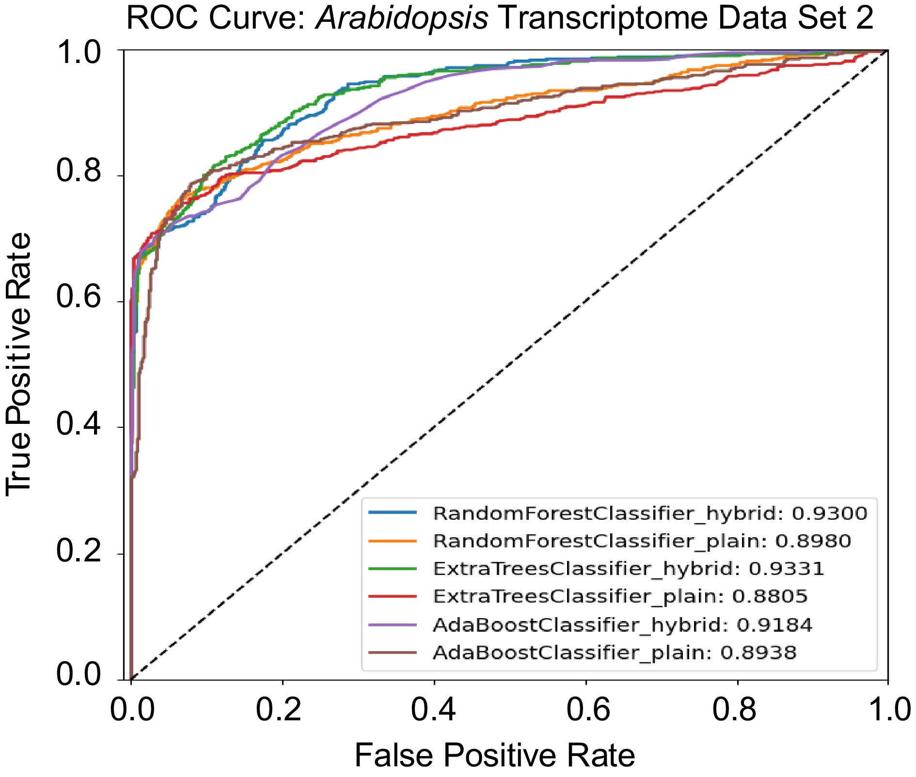 Receiver operating characteristic (ROC) curves comparing the performance of hybrid and plain models on the Arabidopsis Transcriptomic Test Data Set 2.