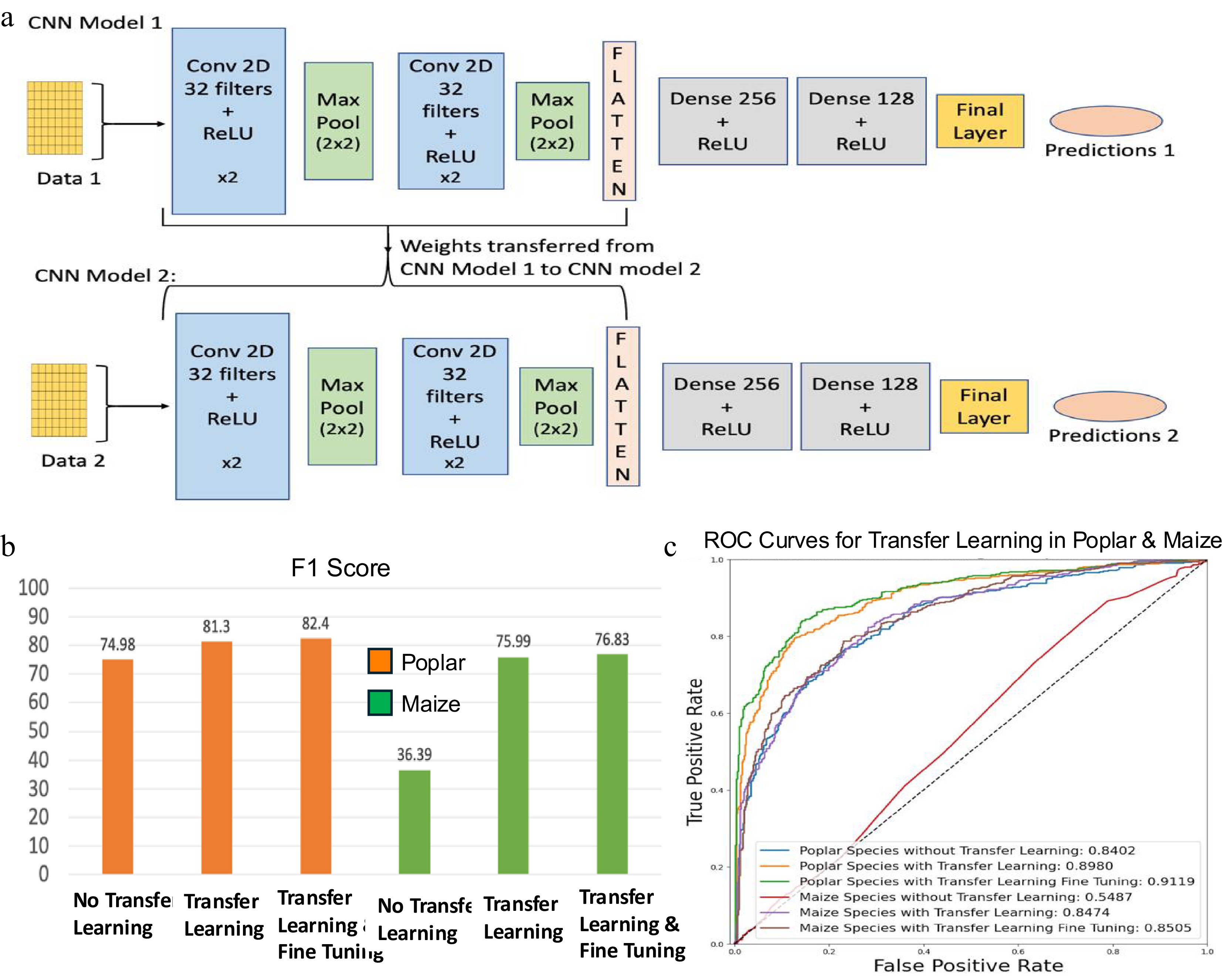 • In this study, we implemented a transfer learning approach to enable knowledge transfer from Arabidopsis to poplar and maize. This strategy allowed model training on poplar and maize using fewer samples than were required for Arabidopsis. The architecture of the transfer learning framework based on CNNs is illustrated in Fig. 7a. Model 1, referred to as the base CNN model, was trained using 80% Arabidopsis training data for 100 epochs, utilizing Binary Cross-Entropy (BCE) as the loss function, the RMSprop optimizer with a learning rate of 0.00003, and a batch size of 100. Once the model was successfully trained, its performance was evaluated on the 20% holdout test data of Arabidopsis. CNN Model 1 demonstrated an accuracy of 95.95% and an AUC score of 96.03% for Arabidopsis holdout test data. After Model 1 was successfully trained and tested with Arabidopsis training and testing data, the learned parameters for the convolutional layers were transferred to CNN Model 2 (Fig. 7a). CNN Model 2 was then fine-tuned separately using poplar and maize training data and tested using their respective testing data sets. For poplar and maize, the training datasets each included 100 positive and 100 negative regulatory pairs (Table 1a), while the test sets contained 500 positive and 500 negative pairs per species (Table 1b). CNN Model 2 was trained in two stages: first, without fine-tuning, where the transferred weights were frozen and only the final layers were trained on the species-specific data; second, with fine-tuning, where the entire model, including the transferred weights, was further trained on the species-specific data. For the poplar species, CNN Model 2 demonstrated an F1-score of 74.98% (Fig. 7b) and an AUC score of 84.02% without transfer learning (Fig. 7c). However, after incorporating the weights trained on Arabidopsis with CNN Model 1, the F1-score significantly increased to 81.3%, and the AUC score rose to 89.80%. Fine-tuning of these models led to further improvements in performance, yielding an F1-score of 82.4% and an AUC score of 91.19%. For the maize species, without transfer learning, the model's F1-score was only 36.39% and an AUC score of 54.87%. In contrast, after incorporating the weights trained from Arabidopsis's CNN Model 1, the transfer learning model achieved an F1-Score of 75.99% and an AUC score of 84.74%. Fine-tuning the model further enhanced its performance to an F1-score of 76.83% and an AUC score of 85.05%.