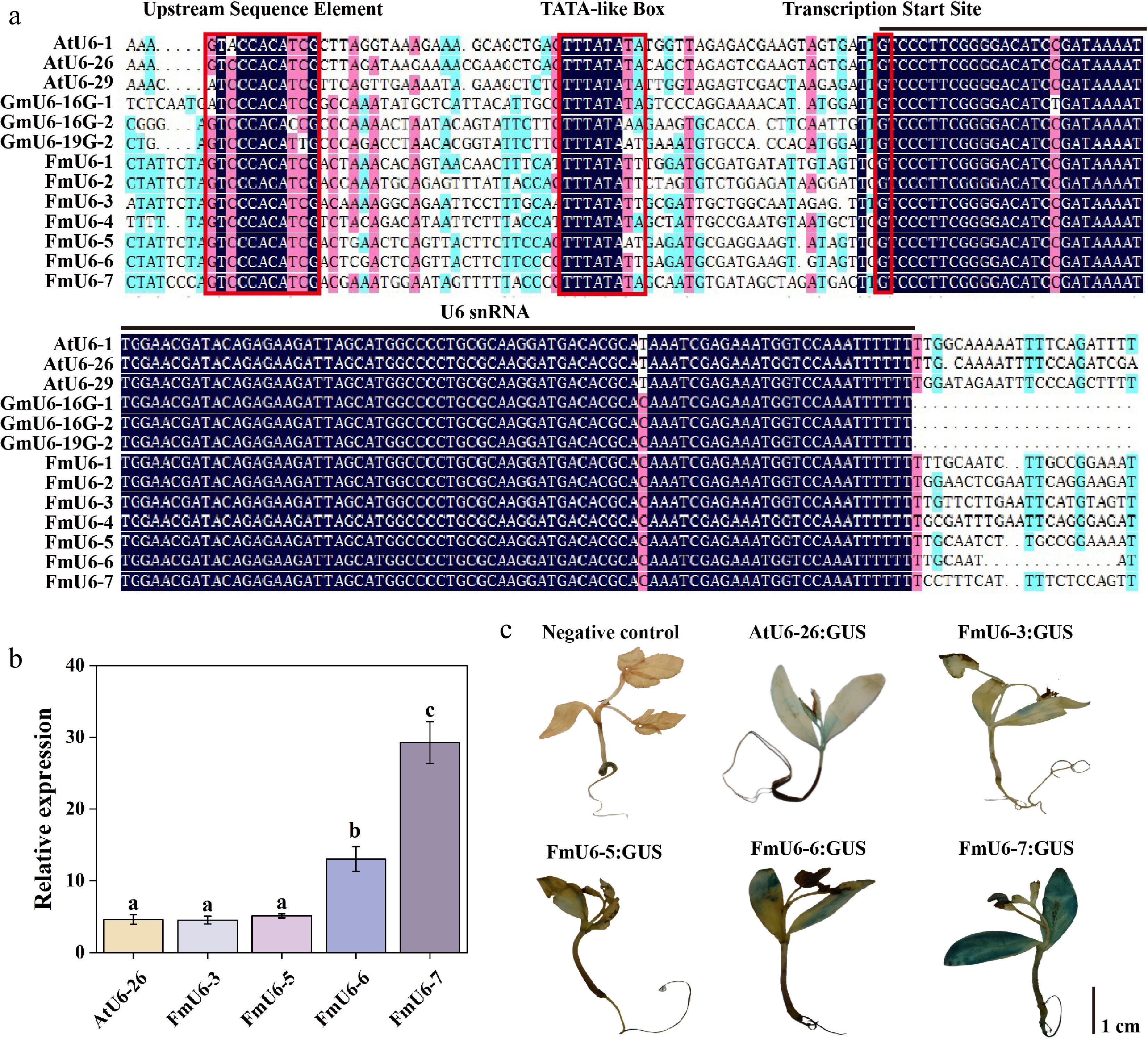 Identification and activity validation of FmU6 promoters in F. mandshurica. (a) Multiple alignments of F. mandshurica, Arabidopsis, and soybean U6 gene and promoter sequences. The red boxes with solid lines indicate upstream sequence element (USE), TATA-like box, and the transcription start site. The black line shows the U6 snRNA transcript. (b) The relative expression levels of GUS driven by the promoters of AtU6-26, FmU6-3, FmU6-5, FmU6-6, and FmU6-7 in seedlings of F. mandshurica. Values represented mean ± SD (n = 3); different letters indicated significant differences (p < 0.05). (c) GUS staining driven by the negative control, promoters of AtU6-26, FmU6-3, FmU6-5, FmU6-6, and FmU6-7 in F. mandshurica seedlings. The scale bar represents 1 cm.