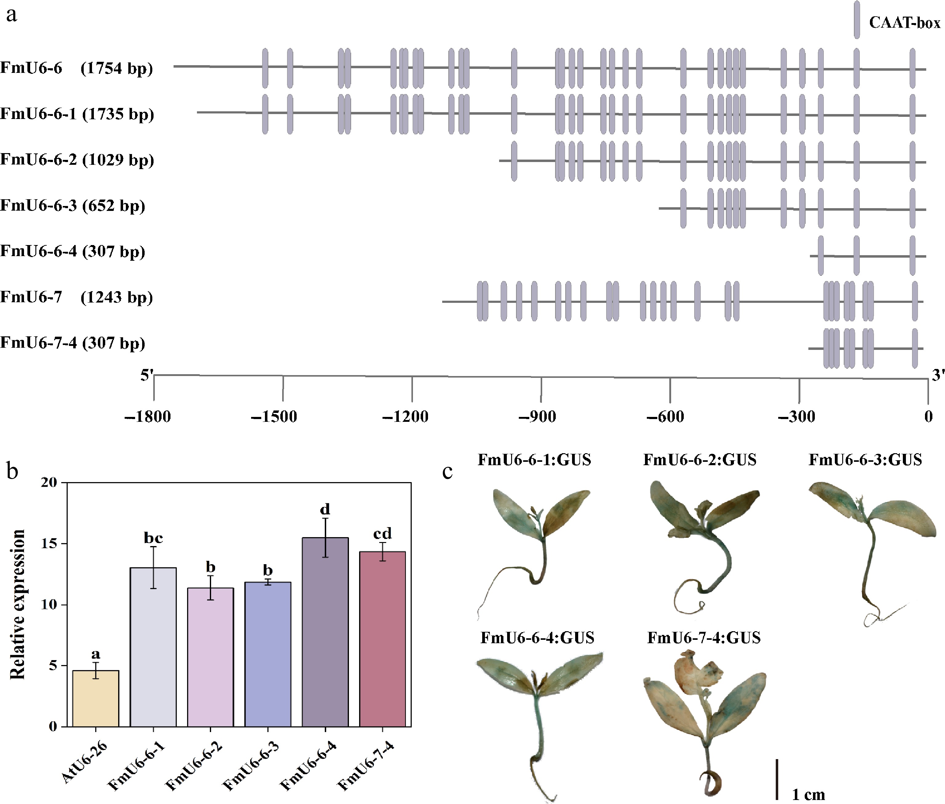 Functional verification of FmU6 promoter fragments. (a) Truncation of FmU6-6 and FmU6-7 promoters. (b) The relative expression levels of GUS driven by the promoters of AtU6-26, FmU6-6-1, FmU6-6-2, FmU6-6-3, FmU6-6-4, and FmU6-7-4 in seedlings of F. mandshurica. Values represented mean ± SD (n = 3); different letters indicated significant differences (p < 0.05). (c) GUS staining in F. mandshurica seedlings. The scale bar represents 1 cm.