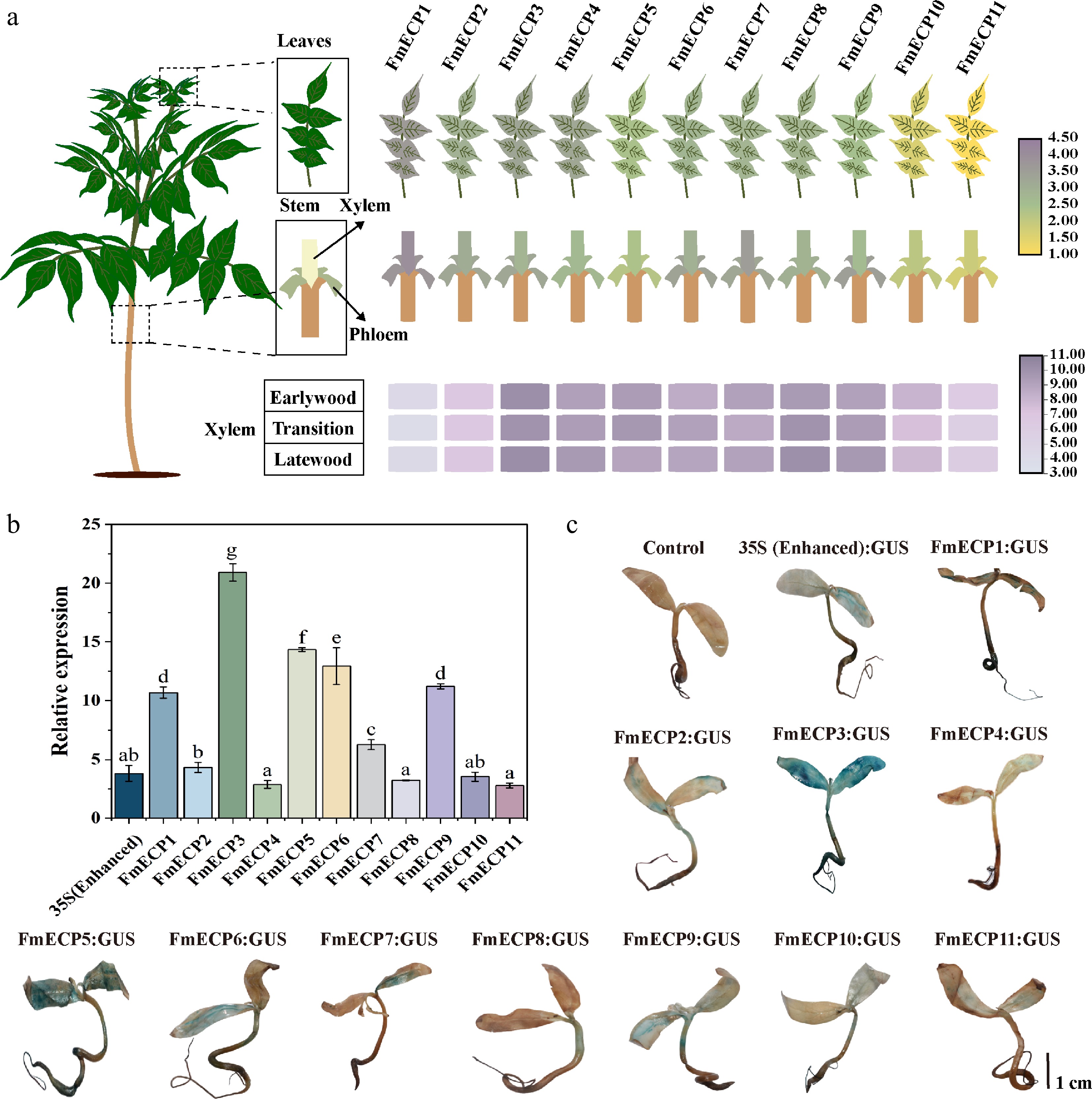 Functional verification of FmECP promoters in F. mandshurica. (a) The expression profiles of genes driven by FmECP promoters, including the relative expression levels in leaves, xylem, phloem, earlywood, transition, and latewood. (b) The relative expression levels of GUS driven by 35S (enhanced) and FmECP promoters in seedlings of F. mandshurica. Values represented mean ± SD (n = 3); different letters indicated significant differences (p < 0.05). (c) GUS staining in F. mandshurica seedlings. The scale bar represents 1 cm.