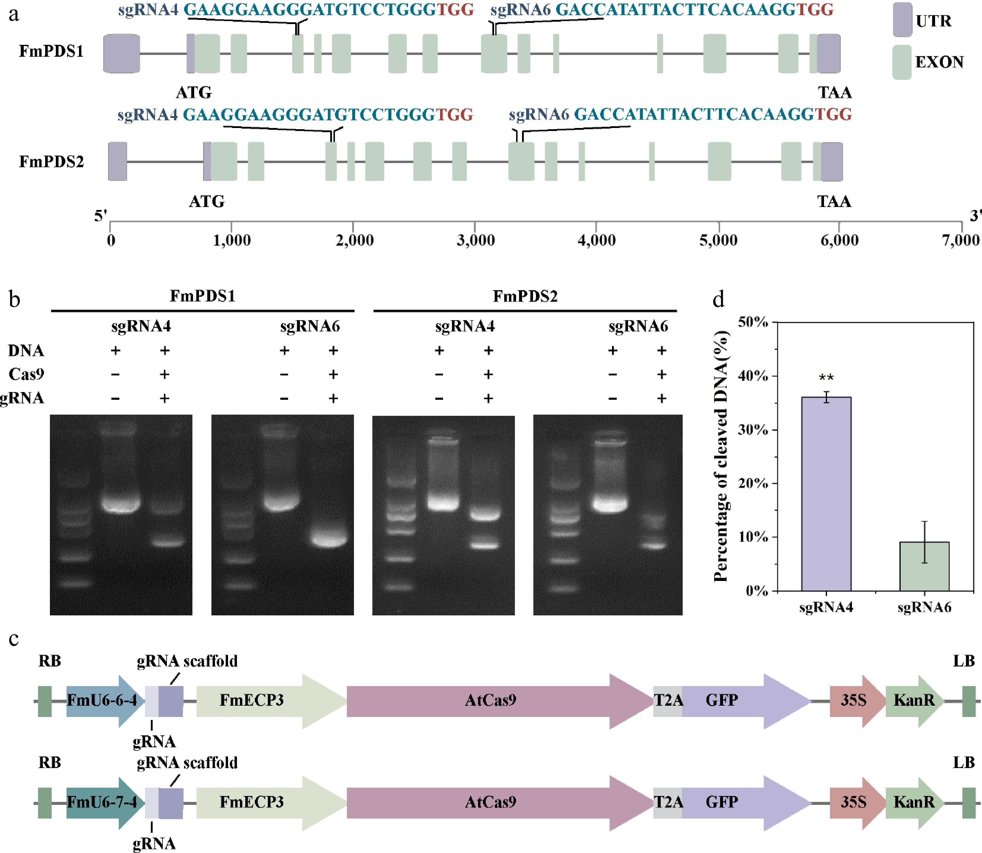 • Defects in PDS gene function result in the albino phenotype of plants, making PDS a convenient gene and indicator in genome editing systems. The F. mandshurica genome contains two highly homologous PDS genes: Chr16G002539 on chromosome 16 (hereafter named FmPDS1) and Chr07G002414 on chromosome 7 (hereafter named FmPDS2) (Fig. 4a; Supplementary Fig. S2). The two paralogues have 14 exons separated by 13 introns in each and consist of 6,055 and 6,011 bp of transcript sequence, respectively, sharing 71.37% identity in nucleotide coding sequence. The amino acid sequences of FmPDS1 and FmPDS2, with lengths of 1,734 and 1,740 bp, respectively, shared 92.59% identity at the amino acid level and possessed typical characteristics of plant phytoene desaturases, including the dinucleotide binding motif, putative substrate conserved motif, and carotenoid binding domain (Supplementary Fig. S3). gRNAs were designed for both FmPDS1 and FmPDS2 using online tools, in which gRNA4 and gRNA6 designed to target two conserved sites located showed the highest efficiency (Fig. 4a). The sgRNA4 binding to FmPDS1 and FmPDS2 was located on the third exons of two genes (red letters in Supplementary Fig. S2); and the sgRNA6 binding to FmPDS1 and FmPDS2 was located on the eighth exons of two genes (blue letters in Supplementary Fig. S2). The corresponding sequences were constructed into the pEgU6E3 and pEgU7E3 vectors, in which Cas9 was induced by the FmECP3 promoter and gRNA4 was driven by FmU6-6-4 and FmU6-7-4 promoters, respectively (Fig. 4c). The addition of Cas9 protein and gRNA effectively cleaved DNA in vitro (Fig. 4b). Furthermore, the cleavage activity of Cas9 at these two sites was determined in vivo through the TCEP method, revealing that the efficiency targeting gRNA4 reached 36.10%, which was 3.97-fold of gRNA6 (Fig. 4d). Therefore, gRNA4 was selected for further research.