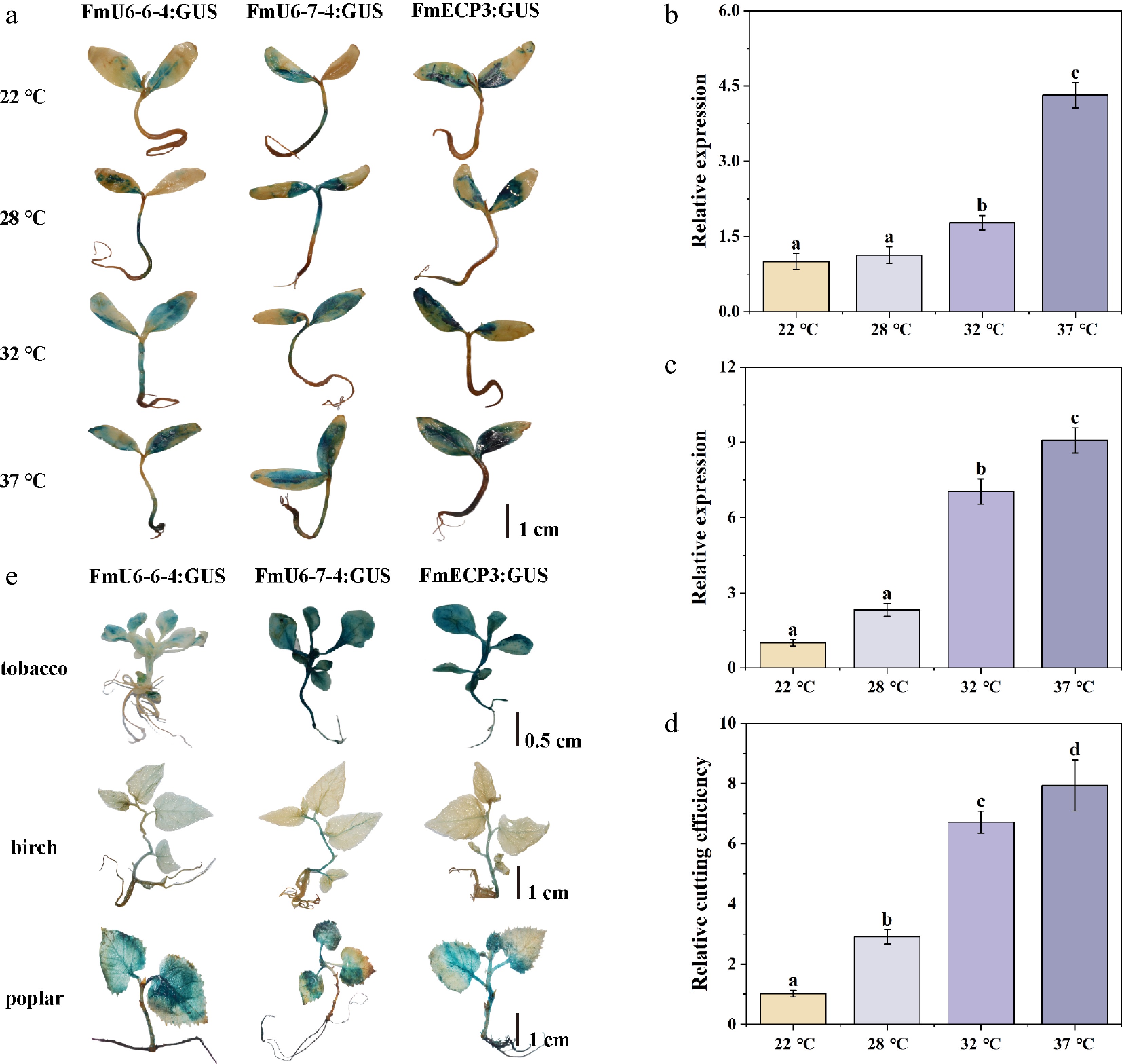 Temperature effect on CRISPR-Cas9-mediated genome editing. (a) The staining of GUS driven by FmU6-6-4, FmU6-7-4, and FmECP3 promoters under different temperature (22, 28, 32, 37 °C) treatments in F. mandshurica seedlings. The scale bar represents 1 cm. (b) The relative expression level of gRNA driven by FmU6-7-4 promoter. (c) Cas9 driven by FmECP3 promoter in seedlings of F. mandshurica under different temperature treatments. (d) Determination of the cutting efficiency under different temperature treatments. Values represented mean ± SD (n = 3); different letters indicated significant differences (p < 0.05). (e) GUS staining in tobacco, birch, and poplar seedlings. GUS was under the control of promoters of FmU6-6-4, FmU6-7-4, and FmECP3. The scale bar represents 1 cm.