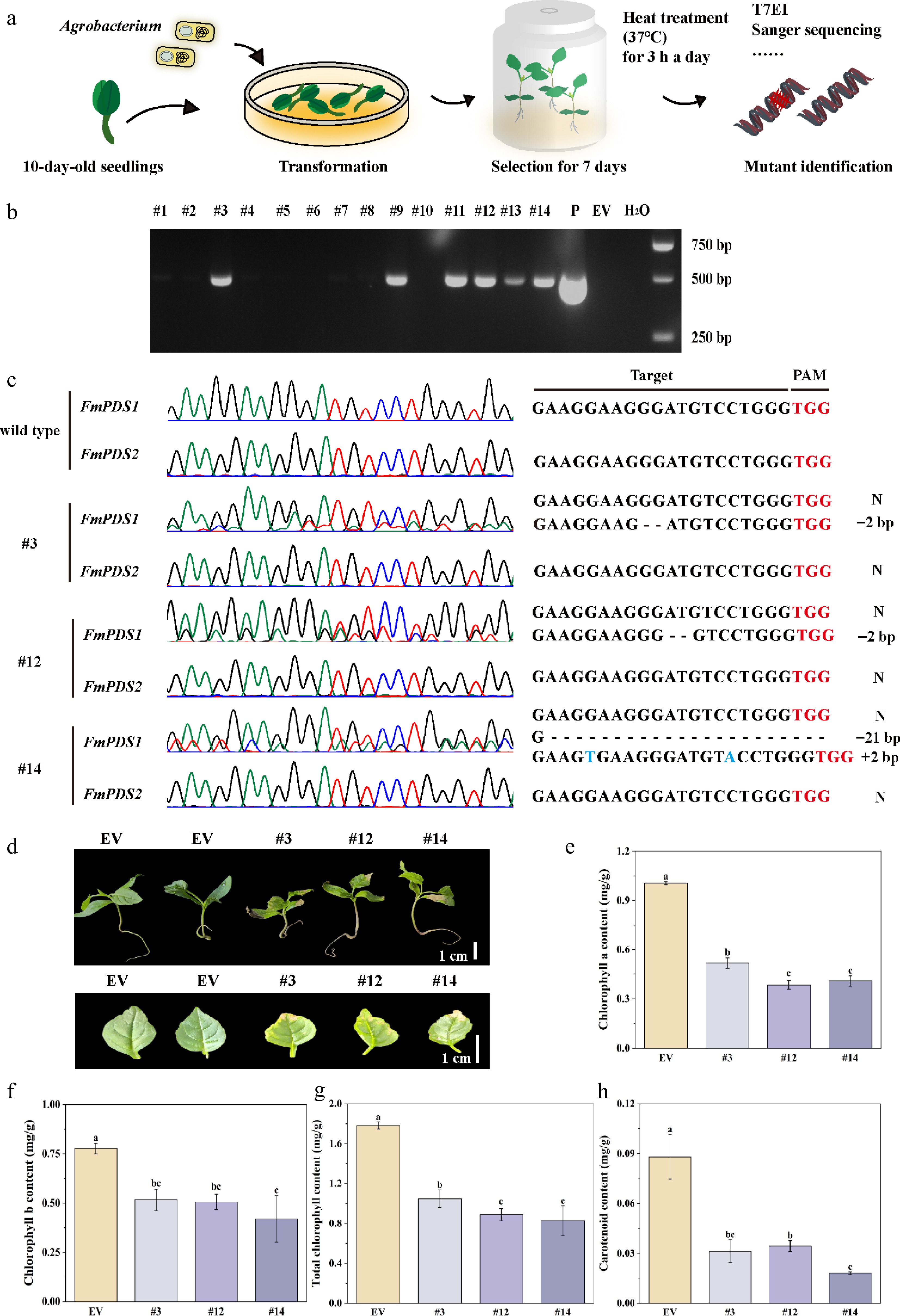 Transient transformation mediated CRISPR/Cas9 system in F. mandshurica. (a) Flow chart of the CRISPR/Cas9 system in F. mandshurica mediated by transient transformation. (b) PCR assay of the genomic DNA of six transgene-positive seedlings (#3, #9, #11, #12, #13, #14). P, plasmid; EV, empty vector. (c) Sanger sequencing results of FmPDS1 and FmPDS2 in mutations. N, without mutation. +, insertion, –, deletion. (d) Phenotypes of mutations, including the whole plant and true leaf. The scale bar represents 1 cm. (e) Statistics of chlorophyll a. (f) Chlorophyll b. (g) Total chlorophyll content. (h) Carotenoid content. Values represented mean ± SD (n = 3); different letters indicated significant differences (p < 0.05).