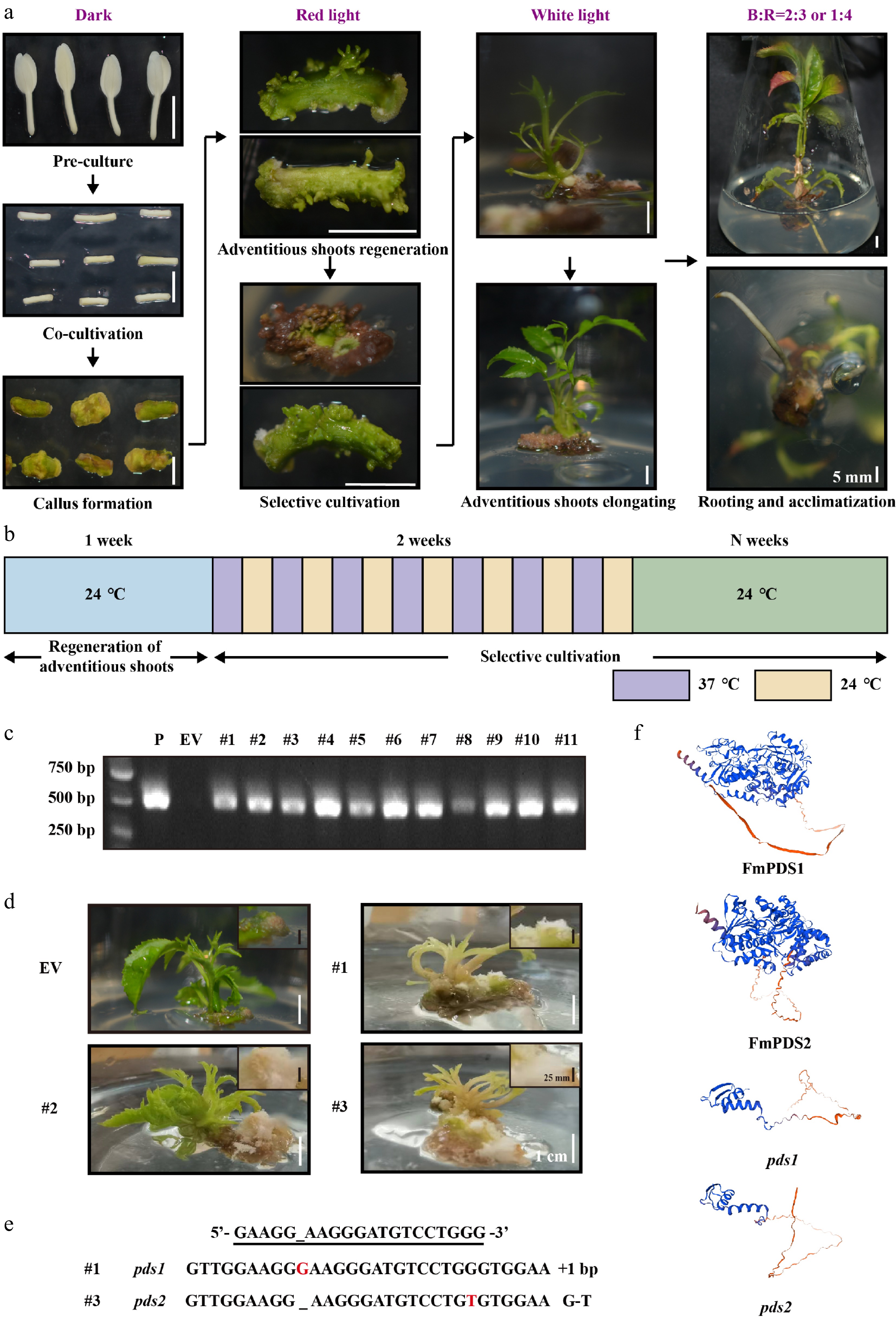 CRISPR/Cas9 genome editing of FmPDS1/2 genes in F. mandshurica. (a) Agrobacterium-mediated genetic transformation process of F. mandshurica with hypocotyl explants. The scale bar represents 5 mm. (b) Schematic diagram of high temperature (37 °C) and room temperature (24 °C) alternating culture during selective cultivation. (c) PCR assay of the genomic DNA of seedlings. P, plasmid; EV, empty vector. (d) Bleaching phenotype of FmPDS gene-mutated plants of F. mandshurica. EV, non-edited plants. The white scale bar represents 1 cm. The callus was enlarged in the upper right corner. The black scale bar represents 25 mm. (e) Sanger sequencing results of mutations (#1 and #3). +, insertion; G-T, G substituted by T. (f) The 3D structures of FmPDS1, FmPDS2, pds1 mutation in #1, and pds2 mutation in #3.