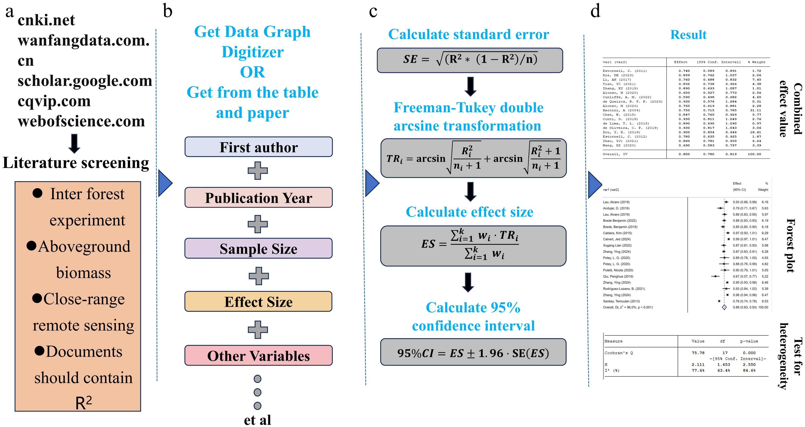 • Multi-source data collaboration has been a hot spot in AGB estimation over recent years, as well as in close-range remote sensing research. Therefore, this study compared the accuracy of multi-source close-range remote sensing data with that of single-sensor remote sensing data (Fig. 6c). Looking at the results alone, it appeared that multi-source data (ES = 0.8; 95% CI: 0.77−0.84, Table 5) did not significantly improve the estimation accuracy of AGB compared with single data sources and were even lower than the ES of ground lidar (ES = 0.93; 95% CI: 0.92−0.94). However, from the perspective of specific research contexts, two key factors contributed to this outcome. First, substantial heterogeneity existed across forest plots. Multi-source remote sensing was typically applied to forests characterized by complex vertical stratification and dense horizontal structures—environments that were often inaccessible to manual survey efforts. In such cases, relying on a single data source, particularly ground lidar, was unlikely to yield comparable accuracy[49]. Second, differences in the research scale played a critical role. Ground lidar was predominantly employed at the single-tree and plot scales, whereas multi-source remote sensing was more frequently utilized for large-scale AGB estimation[34]. At such broader scales, the accuracy of estimation tended to decline, and the inherent complexity of forest structure further exacerbated this reduction in precision[50,51]. Therefore, the coordinated integration of multi-source data emerged as a robust and effective strategy, enabling compensation for the limitations of individual data types and facilitating more accurate estimations of AGB under structurally complex stand conditions.