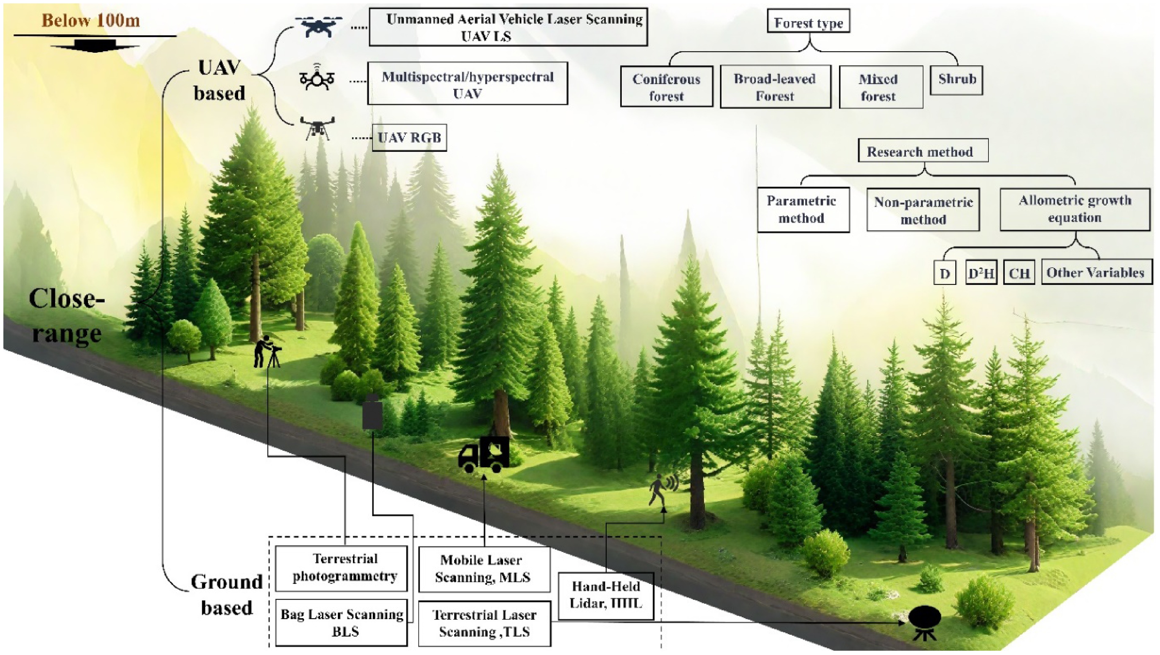 As the scale of research broadens, sensor selection must increasingly prioritize the comprehensiveness and representativeness of the acquired data to counteract the adverse effects of error accumulation on the accuracy of estimation. An expanding body of literature has underscored the value of integrating multi-source data across spatial scales and sensing platforms to enhance both the precision and reliability of forest AGB assessments. For example, ground lidar was frequently utilized to extract key structural parameters such as DBH and H, which were subsequently employed to construct AGB estimation models that are applicable to large-scale forested landscapes[72,73]. This methodology is often complemented by auxiliary datasets—such as UAV lidar, hyperspectral, and multi-spectral imagery—for model support and validation of the accuracy. Such multi-source fusion not only significantly improves the precision of estimation but also effectively reduces the labor intensity and logistical complexity of large-scale data acquisition [26,74].