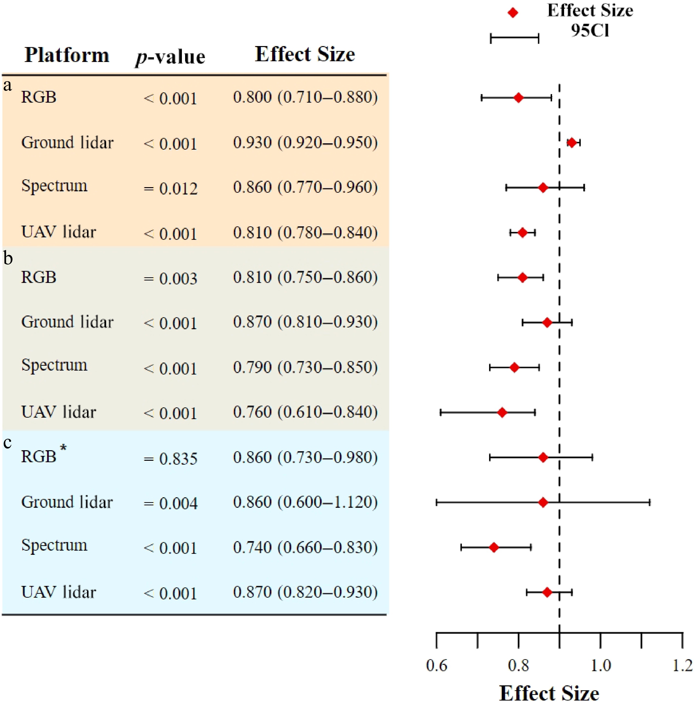 At the stand scale (which accounted for 10.48% of the sample size), all methods except spectra (ES = 0.74; 95% CI: 0.66–0.83) achieved high ES, which was sufficient to prove their reliability at this scale. Although the ground lidar had the highest ES on all three scales, the increase in the research scale reduced the sample size and the accuracy, so the workload and uncertainty were significantly improved[45]. Therefore, the use of UAV RGB, especially UAV lidar, should be the preferred method at the stand scale[46].