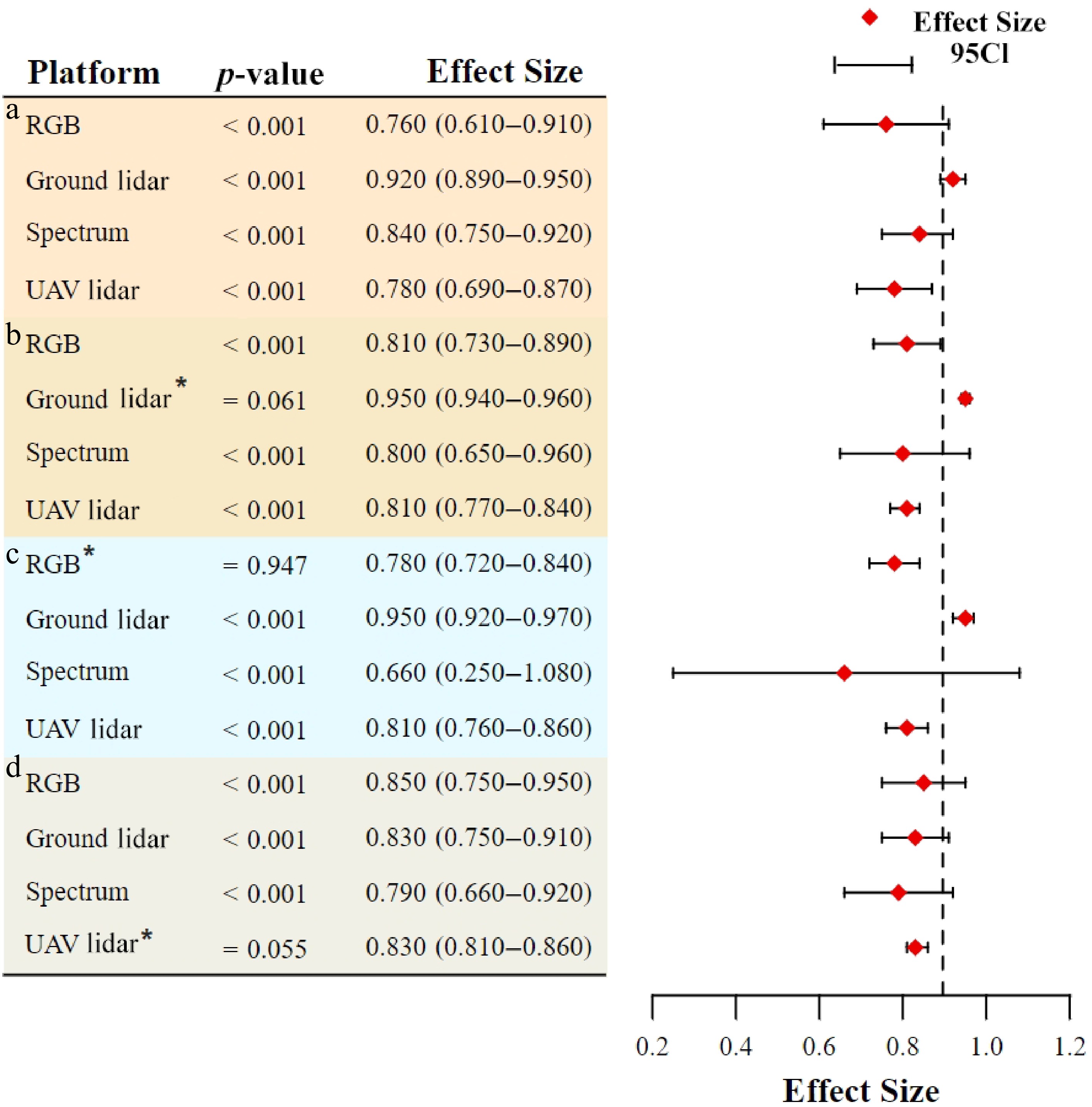 • There were significant differences in technical performance among different forest types (Fig. 5). Ground lidar had the highest ES in all forest types. In addition, the spectra (ES = 0.84; 95% CI: 0.75–0.92) had the highest ES in broadleaf forests (which accounted for 20.43% of the sample size, Table 2). In coniferous forests, RGB had higher accuracy (ES = 0.81; 95% CI: 0.73–0.89) than the other three sensor types. It may be that the texture features of RGB images were easier to extract due to the single-canopy structure. In the mixed forest, the spectra (ES = 0.66; 95% CI: 0.25–1.07) were limited by the signal saturation of dense canopy. The accuracy of AGB estimation in shrubs was generally low (RGB ES = 0.85; 95% CI: 0.75–0.95; ground lidar ES = 0.83; 95% CI: 0.75–0.91). Because the vertical structure of low vegetation was difficult to capture by lidar, it was necessary to combine high-resolution ground RGB images to extract the data on plant density[47].