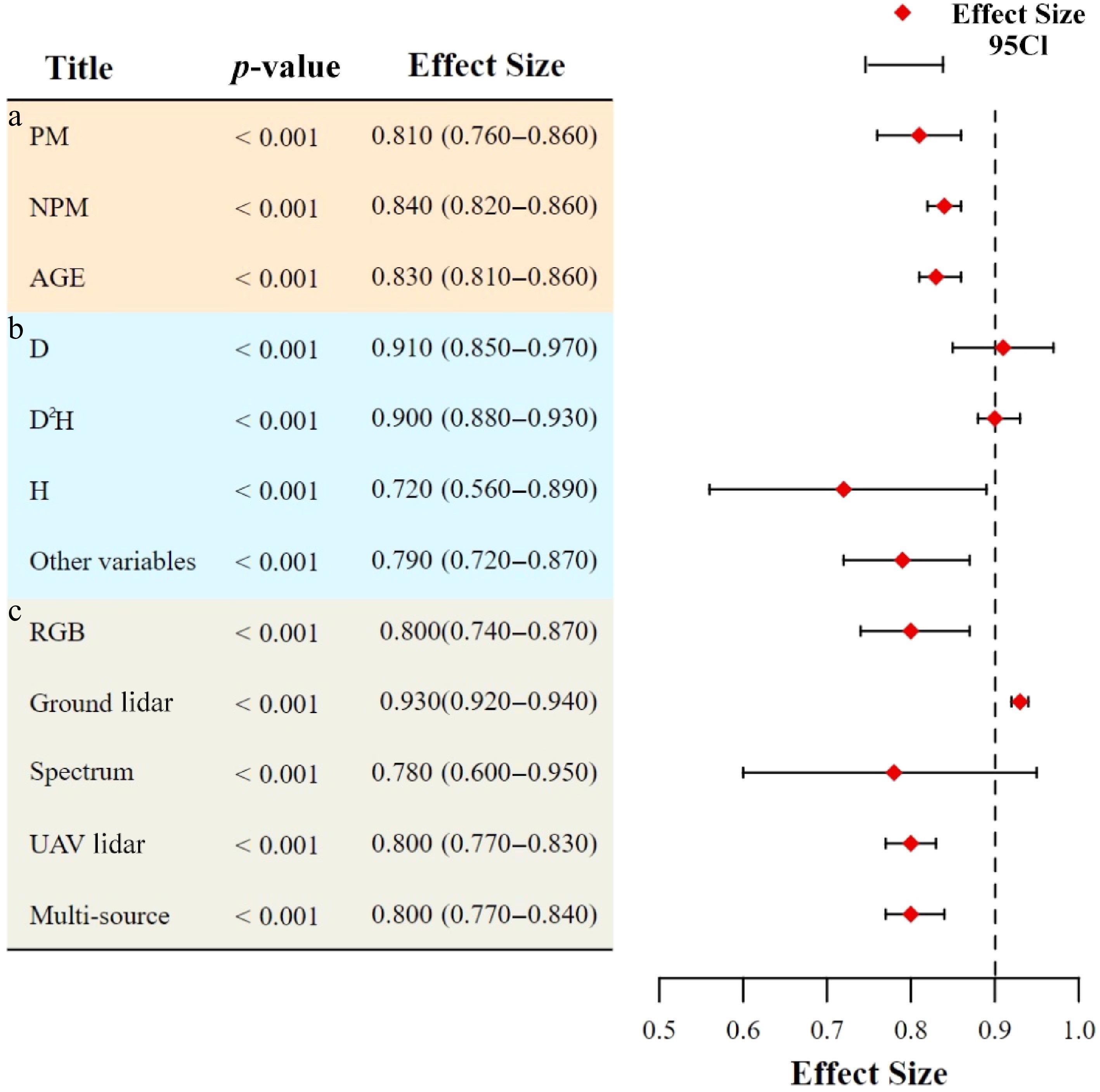 • The results showed that (Table 3, Fig. 6a) there was no significant difference in accuracy among the three methods (p < 0.001). As the standard method of traditional AGB estimation, the allometric growth equation obtained the highest combined ES (ES = 0.83; 95% CI: 0.81−0.86). The non-parametric method (ES = 0.82; 95% CI: 0.80−0.85) also achieved good performance which was basically the same as that of the allometric growth equation (ΔES = 0.01), probably due to the complex non-linear relationship between remote sensing features and AGB that machine learning algorithms can capture. In addition, the non-parametric method had high flexibility and was more adaptable to forests with multiple species and complex structures[48]. In contrast, the parametric method showed lower accuracy (ES = 0.80; 95% CI: 0.76−0.85), which might be limited by the problem of signal saturation in dense canopies where the vegetation index was insensitive.
