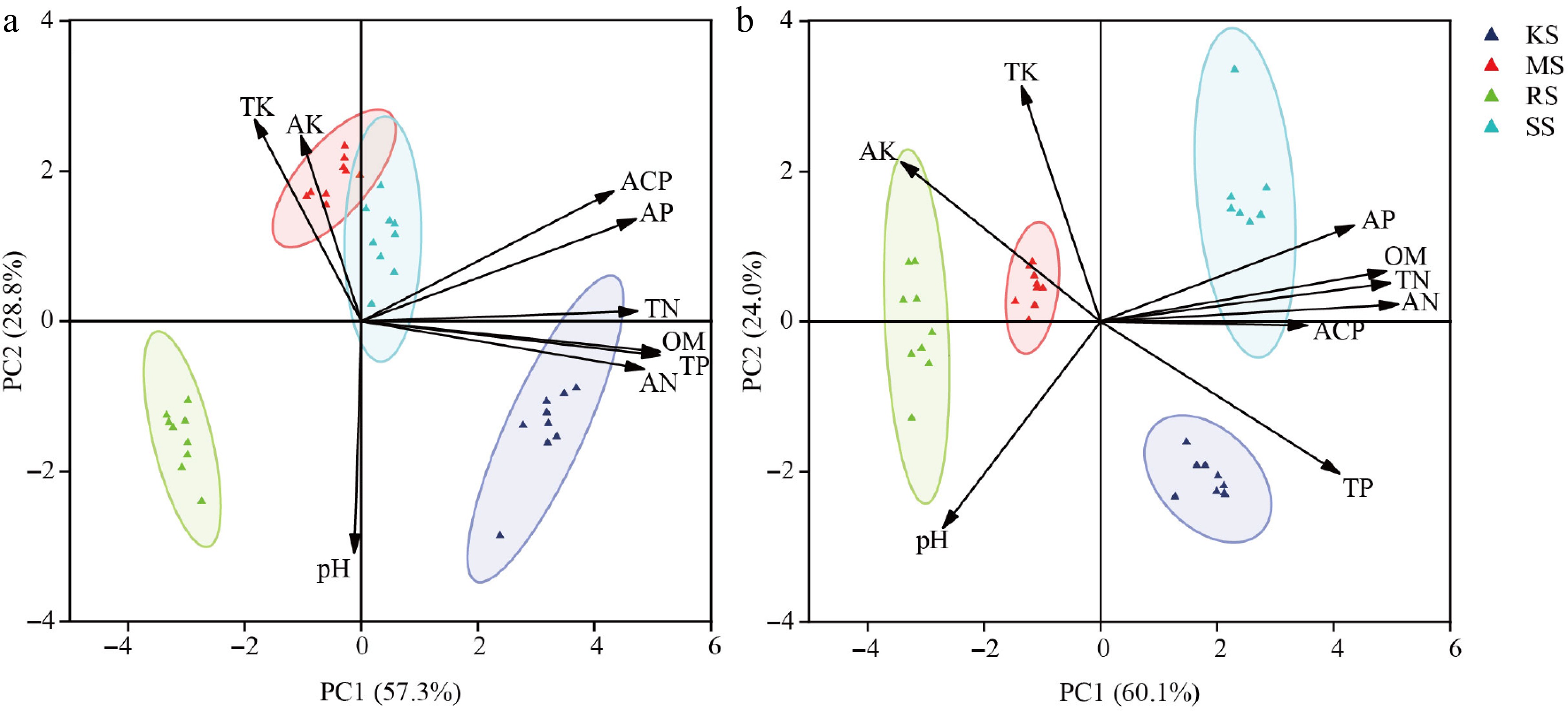 Diversity differences among four soil conditions. (a) Pre-treatment. (b) Post-treatment. The different colored circles in the diagram represent different soil types; TN, total nitrogen; TP, total phosphorus; TK, total potassium; AN, acute nitrogen; AP, available phosphorus; AK, acute potassium; OM, organic matter; ACP, acid phosphatase; pH, acidity and alkalinity.