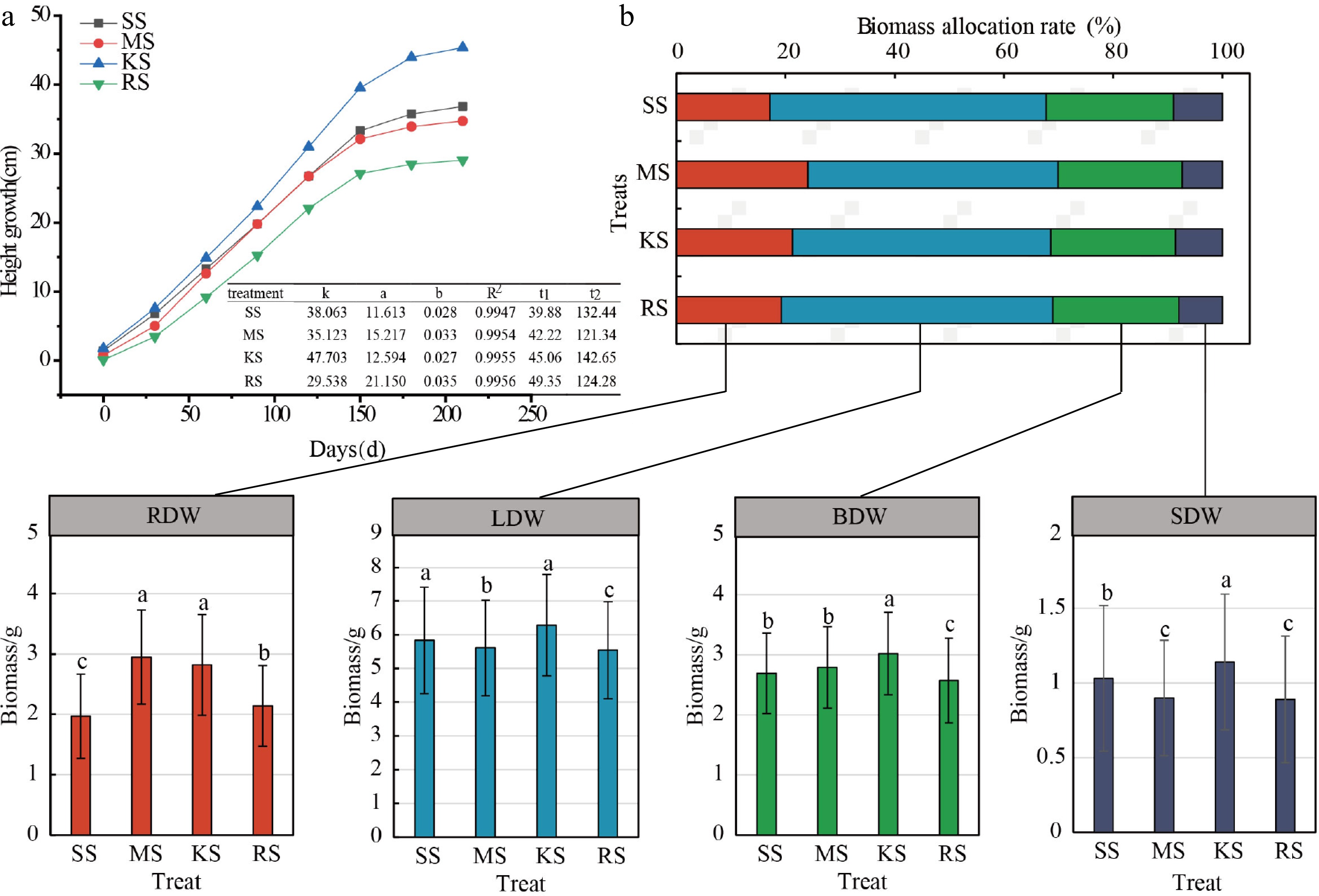 Plant height growth curve and biomass allocation of cedar under different soil treatments. (a) Growth rhythm map, where k is the theoretical limit value of the upper limit value of the growth, and a and b are the coefficients to be determined, R2: coefficient of determination represents the goodness of fit of the model, reflecting the extent to which the independent variable explains the variation in the dependent variable.t1: the start time of the rapid growth period; t2: end of rapid growth period. (b) Biomass distribution graph. The horizontally arranged bar chart represents the biomass allocation proportions among root, stem, trunk, and leaf organs, while the vertically arranged bar chart indicates the variation in biomass measurements of each organ across treatments; Different lowercase letters denote significant differences between treatments. ADW: Aboveground dry weight; LDW: Leaf dry weight; BDW: Branch dry weight; SDW: Stem dry weight; RDW: Root dry weight.