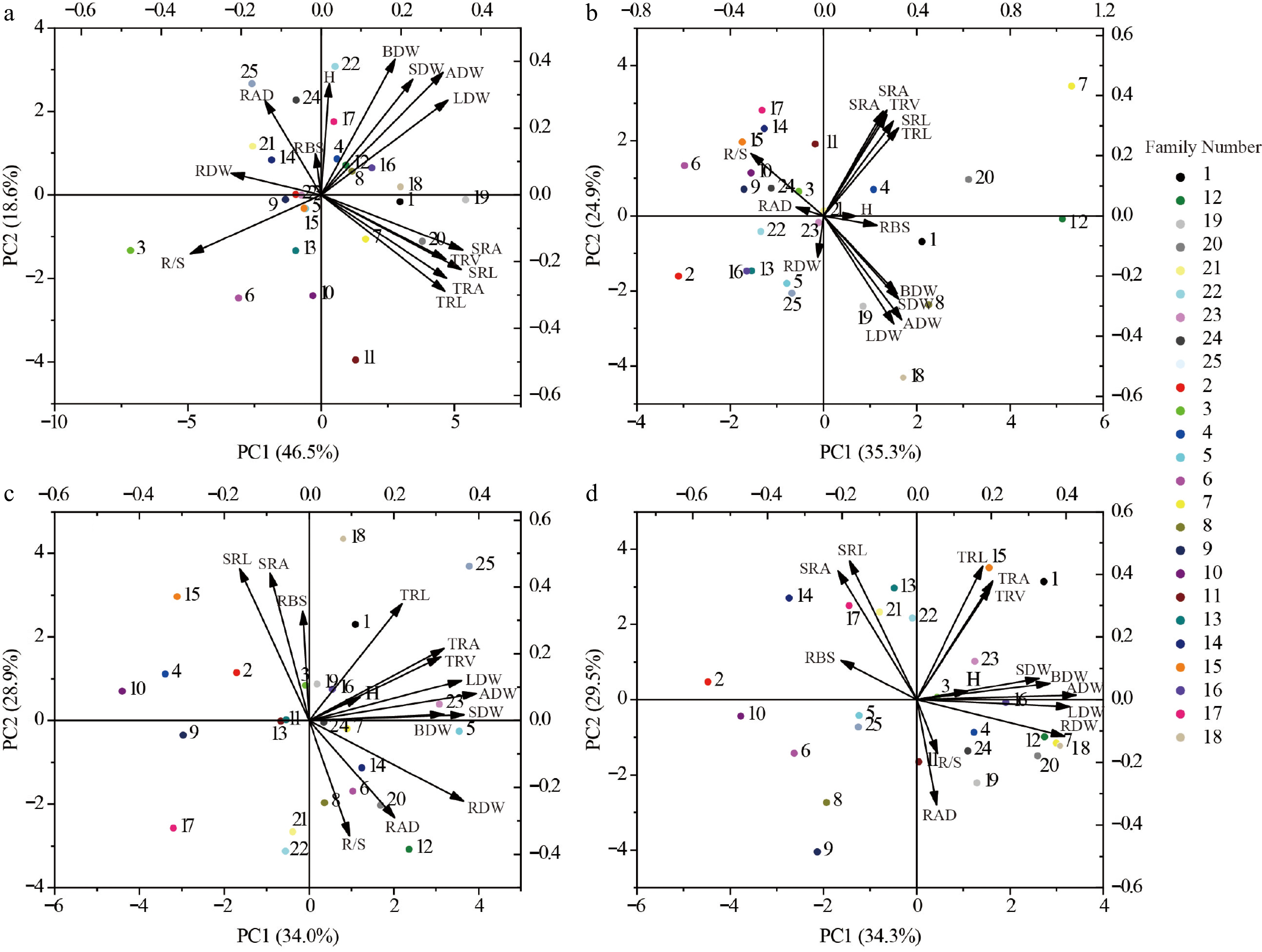 Selection of different genotypes for growth in each of the four soils. (a) SS Soil conditions. (b) MS Soil conditions. (c) KS Soil conditions. (d) RS Soil conditions. The numbered points in the diagram represent different families of Chinese fir. H, Plant height; ADW, Aboveground dry weight; LDW, Leaf dry weight; BDW, Branch dry weight; SDW, Stem dry weight; RDW, Root dry weight; SRL, Specific root length; SRA, Specific root area; RAD, Root average diameter; RBS, Root branching strength; TRL, Fine root length; TRA, Fine root surface area; TRV, Fine root volume; R/S, Root to shoot ratio. Different colored circles represent different family.