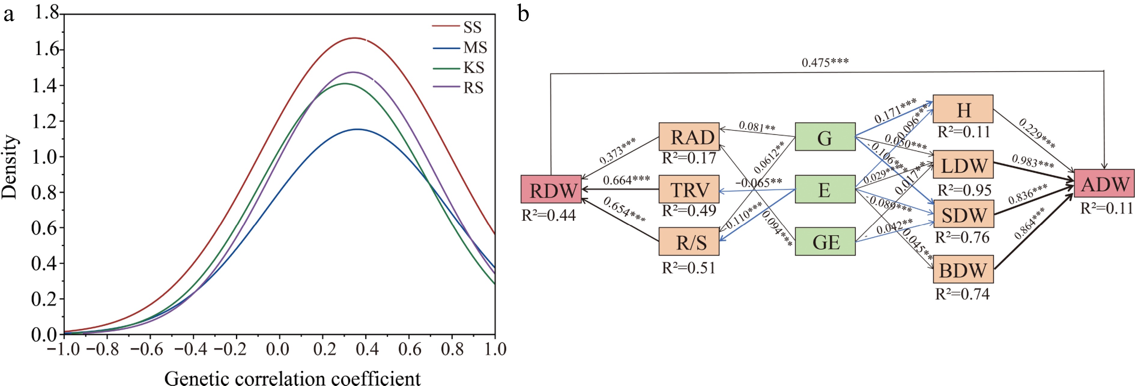 (a) Frequency distribution of genetic correlation indices between all traits. The frequency of distribution of correlation coefficients, measured as genetic correlation coefficients between two indices, was calculated 91 times using 14 traits. (b) Partial least squares structural equation modeling (PLS-SEM) reveals direct and indirect effects of genotype and environment on growth and root function traits. AIC = 36.18, Fisher's C = 41, p = 0.072 in the model, Solid blue arrows indicate negative paths (p < 0.05), solid black arrows indicate positive paths (p < 0.05), and the width of the arrows indicates the strength of the causal relationship. Numbers on the line adjacent to the arrows are standardized path coefficients. R2 indicates the total variance explained by the model. H, Plant Height; ADW, Aboveground dry weight; LDW, Leaf dry weight; BDW, Branch dry weight; SDW, Stem dry weight; RDW, Root dry weight; RAD, Root average diameter; TRV, Fine root volume; R/S, Root to shoot ratio; * p < 0.05; ** p < 0.01; *** p < 0.001.