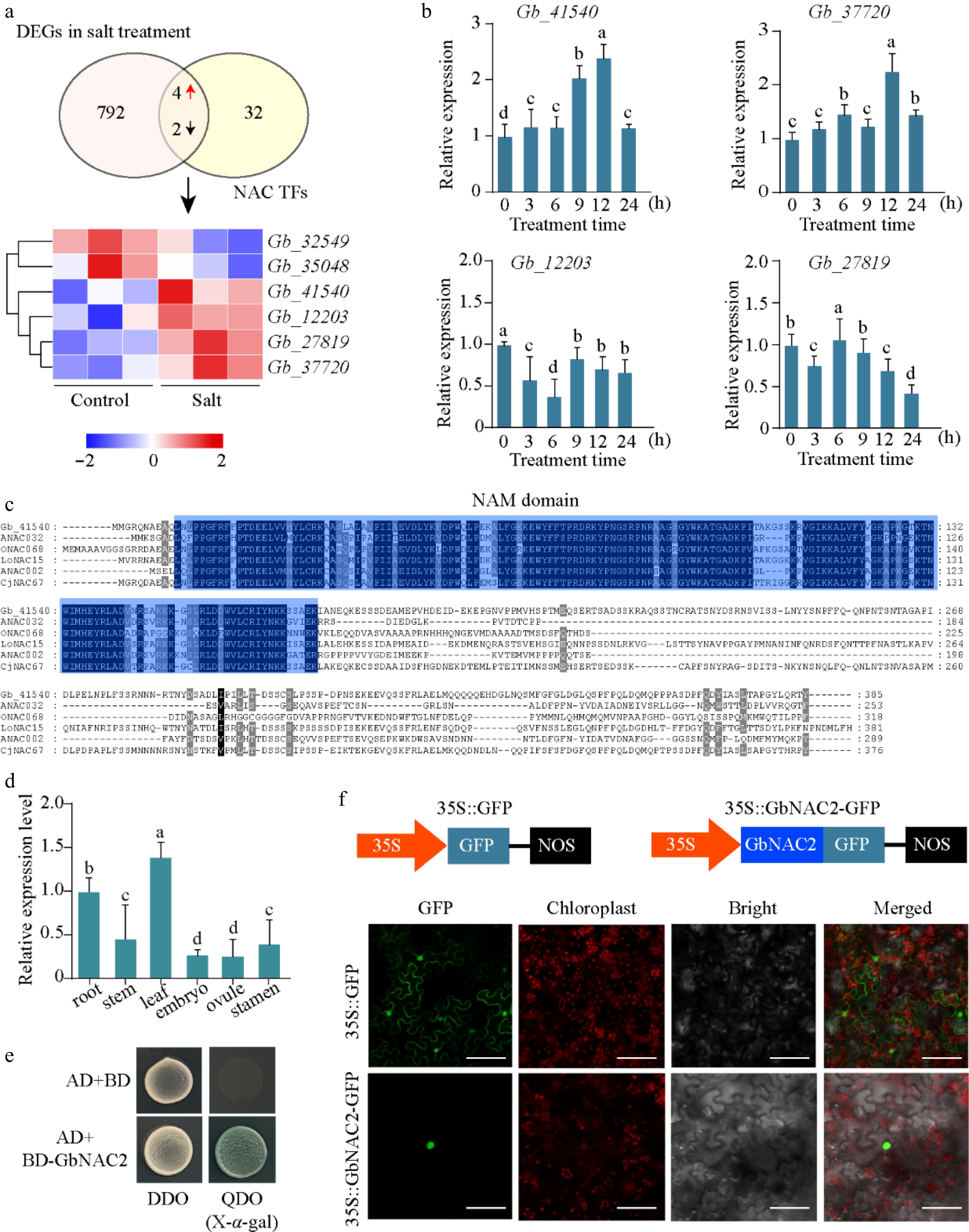 Gb_41540 contains an open reading frame of 1,158 bp and is predicted to encode a 385-amino-acid protein featuring a conserved NAM domain typical of the NAC transcription factor family (Fig. 1c). Phylogenetic analysis showed that the Gb_41540 protein was clustered together with NAC002 from A. thaliana, and Gb_41540 was referred to as GbNAC2 (Supplementary Fig. S1). Tissue-specific expression analysis revealed that the highest GbNAC2 expression in leaves and roots (Fig. 1d). To test the transcriptional activation activity of the GbNAC2 protein, the full-length GbNAC2 was fused to the GAL4 DNA-binding domain of the pGBKT7 (BD) vector and transformed into yeast. The yeast's growth and blue color on quadruple-dropout medium with X-α-gal indicated GbNAC2 has transcriptional activation (Fig. 1e). Additionally, the transient transformation of tobacco confirmed the nuclear localization of GbNAC2 (Fig. 1f).