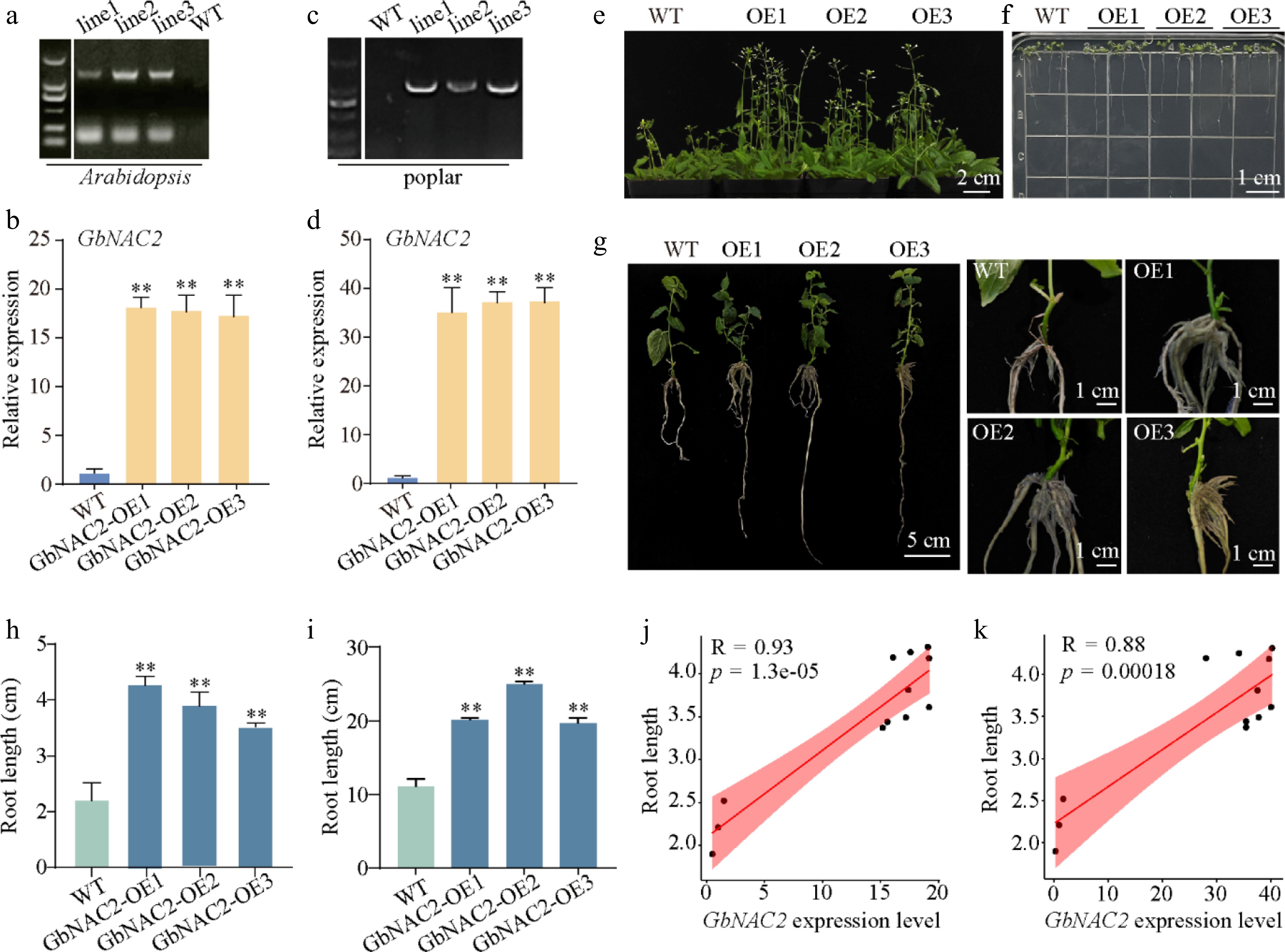 • To explore the functional role of GbNAC2, GbNAC2 overexpression Arabidopsis transgenic lines (GbNAC2-OE) were generated (Fig. 2a, d). The GbNAC2-OE Arabidopsis displayed accelerated growth and earlier flowering phenotype compared to the WT (Fig. 2e). Additionally, transgenic Arabidopsis roots were 1.6–2.0-fold longer than those of the WT plants (Fig. 2f, h). GbNAC2-OE transgenic poplar lines were also generated (Fig. 2c, d). In consistent with GbNAC2-OE Arabidopsis lines, compared to the WT, the number of lateral roots in GbNAC2-OE poplar plants was significantly increased, and root length was approximately 1.6- to 2.4-fold longer than in WT plants (Fig. 2g, i). Furthermore, correlation analysis results displayed a strong association between the expression level of GbNAC2 and root length in transgenic plants (Fig. 2j, k).
