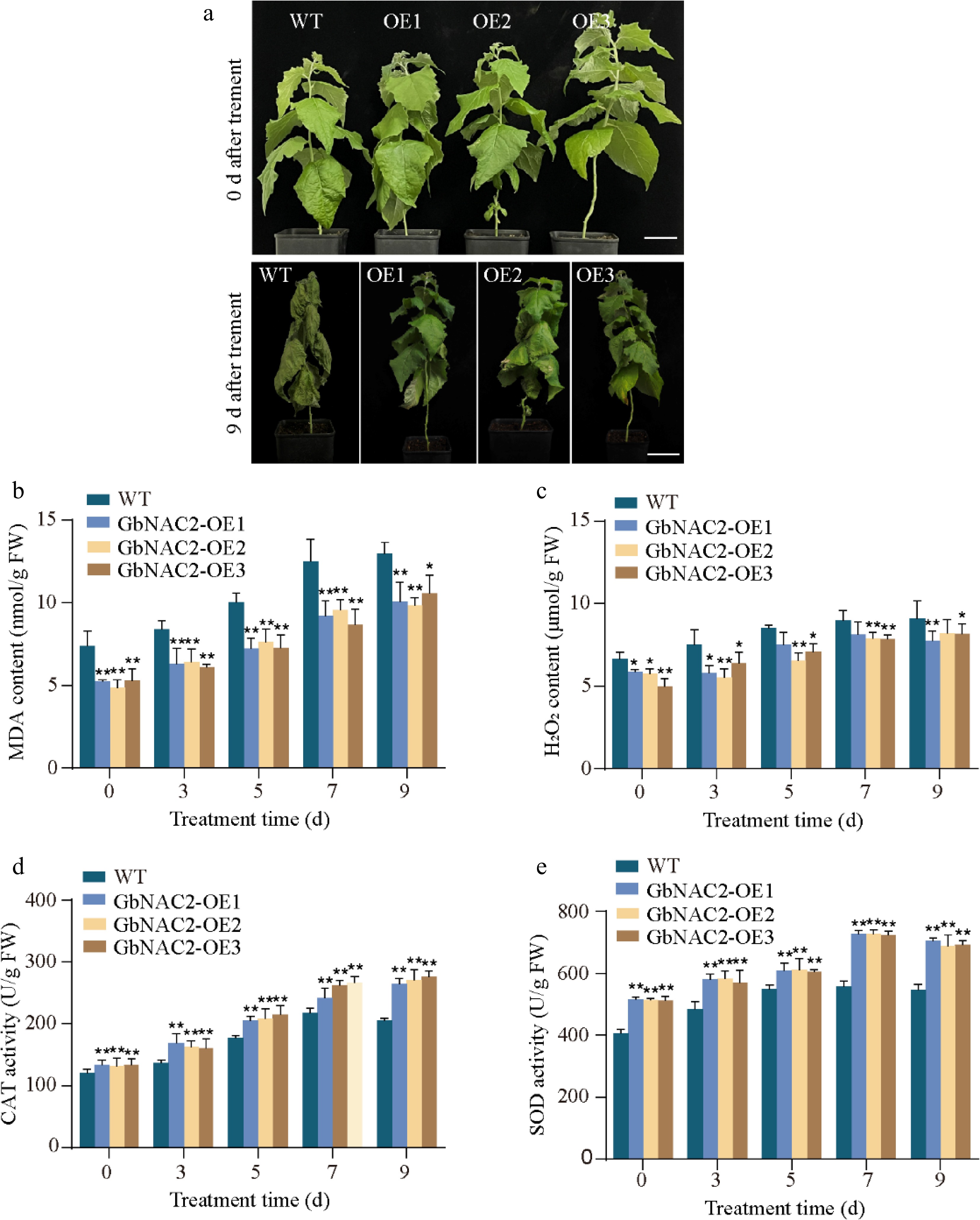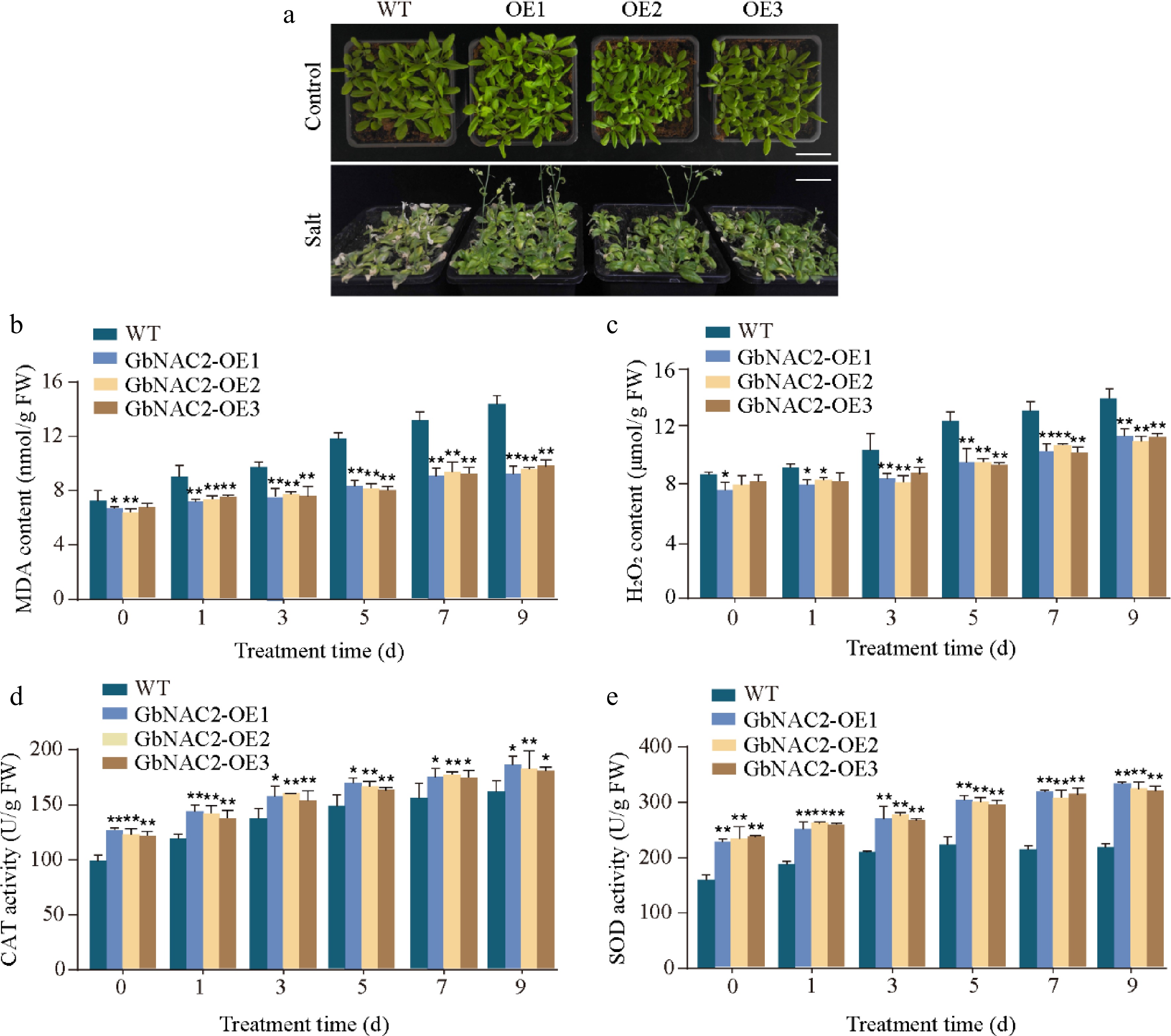 Overexpression of GbNAC2 enhances the salt tolerance in Arabidopsis. (a) Phenotypic appearance of the plants after 9 d of salt treatment. (b) Levels of MDA in leaves. (c) Levels of H2O2 in leaves. (d) Activities of CAT in leaves. (e) Activities of SOD in leaves. * p < 0.05, ** p < 0.01.