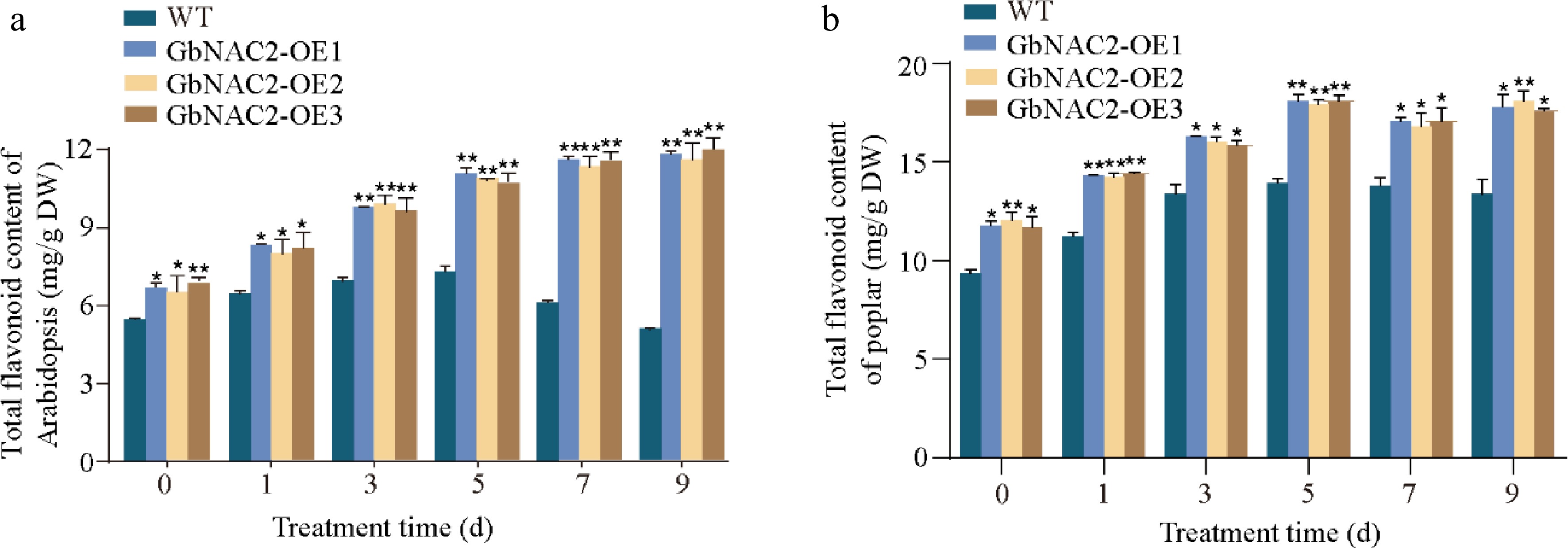 • The flavonoid content in GbNAC2-OE lines after salt treatment were measured. Prior to treatment, the flavonoid content in transgenic Arabidopsis and poplar were 1.2- and 1.3-fold that of the WT, respectively. During salt stress, flavonoid content in WT plants initially increased but then declined, whereas in GbNAC2-OE Arabidopsis, flavonoid levels steadily rose throughout the treatment. After 9 d of salt exposure, flavonoid content in the transgenic Arabidopsis was about 2.1 times higher than in WT plants (Fig. 5a). A similar pattern was observed in poplar, with flavonoid levels in GbNAC2-OE lines reaching approximately 1.4-fold that of WT after 9 d (Fig. 5b).