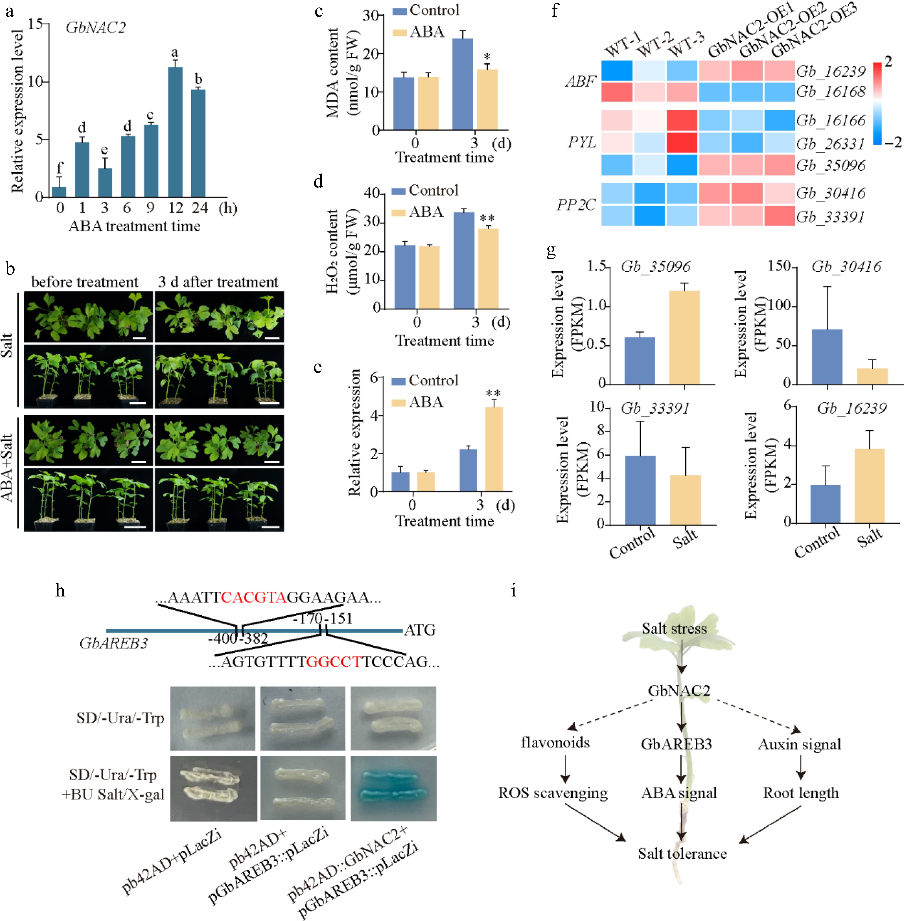GbNAC2 participates in ABA signaling by interacting with GbAREB3 promoters. (a) The expression profile of GbNAC2 within 24 h post ABA treatment. Different letters indicate significant differences (one-way analysis of variance, p < 0.05). (b) Phenotypic changes in ginkgo seedlings before and after NaCl and ABA + NaCl treatment. Scale bar = 4 cm. The content of (c) MDA, (d) and H2O2 before and after NaCl and ABA + NaCl treatment. (e) The expression of GbNAC2 before and after treatment. * p < 0.05, ** p < 0.01. (f) Heatmap of significantly differentially expressed ABA pathway-related genes following overexpression of GbNAC2. (g) Expression analysis of four ABA pathway-related genes under salt stress. (h) Verification of the interaction between GbNAC2 and the GbAREB3 promoter through Y1H assay. (i) Schematic diagram illustrating the promotion of salt stress tolerance in ginkgo by GbNAC2.