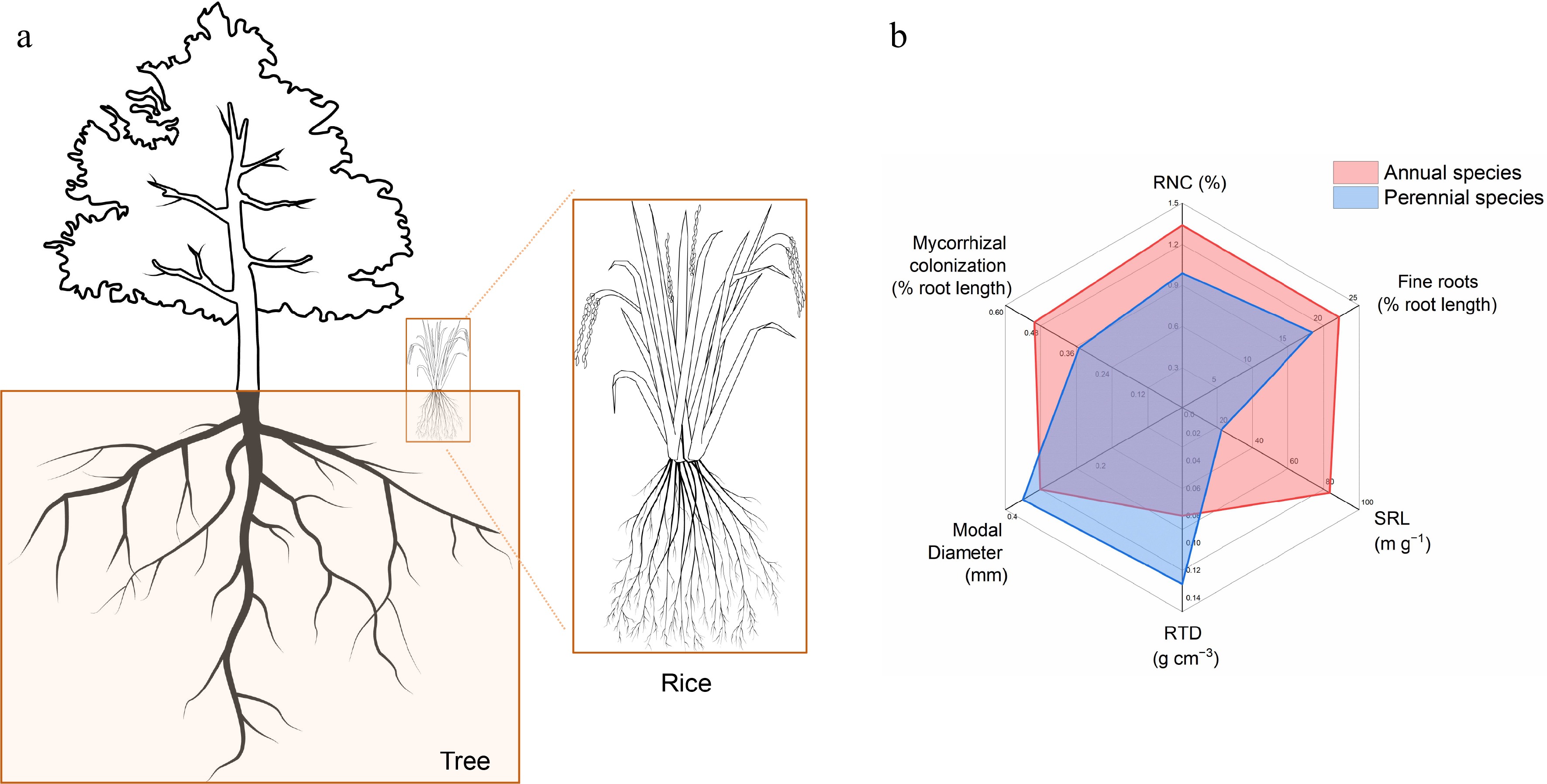 Root system architecture in perennial trees and annual crops. (a) Schematic diagram of RSA in trees and rice. (b) Root traits related to nitrogen absorption in annual species and perennial species according to the data of 18 field-grown species[25]. RNC: root nitrogen concentration; Fine roots: proportion of root length with diameter < 0.2 mm; SRL: specific root length; RTD: root tissue density; modal diameter, the size of the diameter that occurs most.