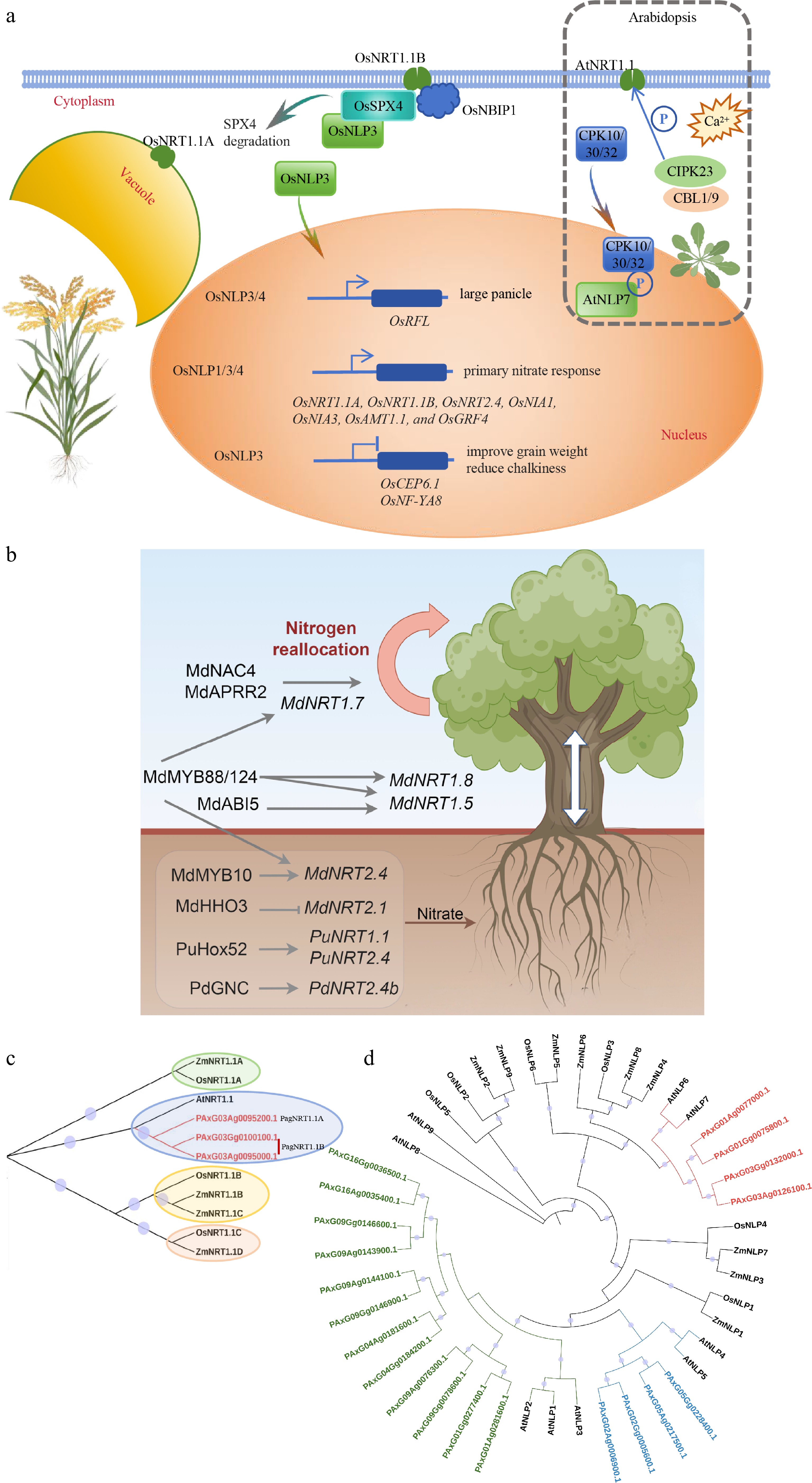 Nitrate sensors function in nutrient uptake and signaling. (a) The role of AtNRT1.1, AtNLP7, and their homologs in rice in nitrate absorption and signal transduction mechanisms. (b) Nitrate transporters and their modulation in poplar and apple trees. (c) Homologous sequence alignment of NRT1.1 in Arabidopsis, maize, rice, and poplar 84K. (d) Homologous sequence alignment of NLPs in Arabidopsis, maize, rice, and poplar 84K. The phylogenetic tree was constructed using maximum likelihood methods with 5,000 bootstraps in the Tbtools program.