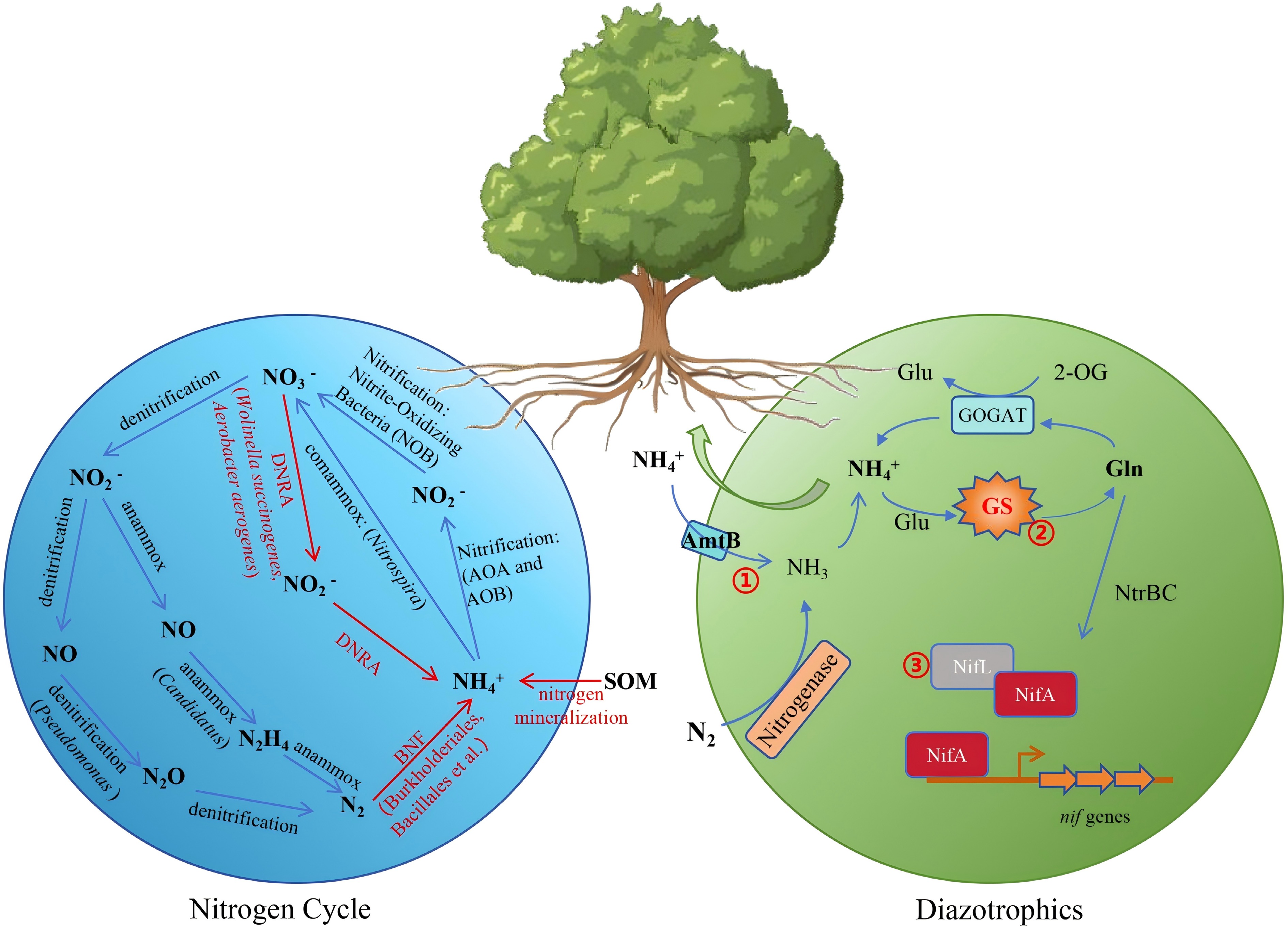 Thus, enhancing NUE in forest plantations can therefore be achieved by targeted manipulation of the soil microbiome: promoting BNF and DNRA to channel nitrogen into retained ammonium, while simultaneously suppressing denitrification, nitrification, and anammox to curb nitrogen losses.