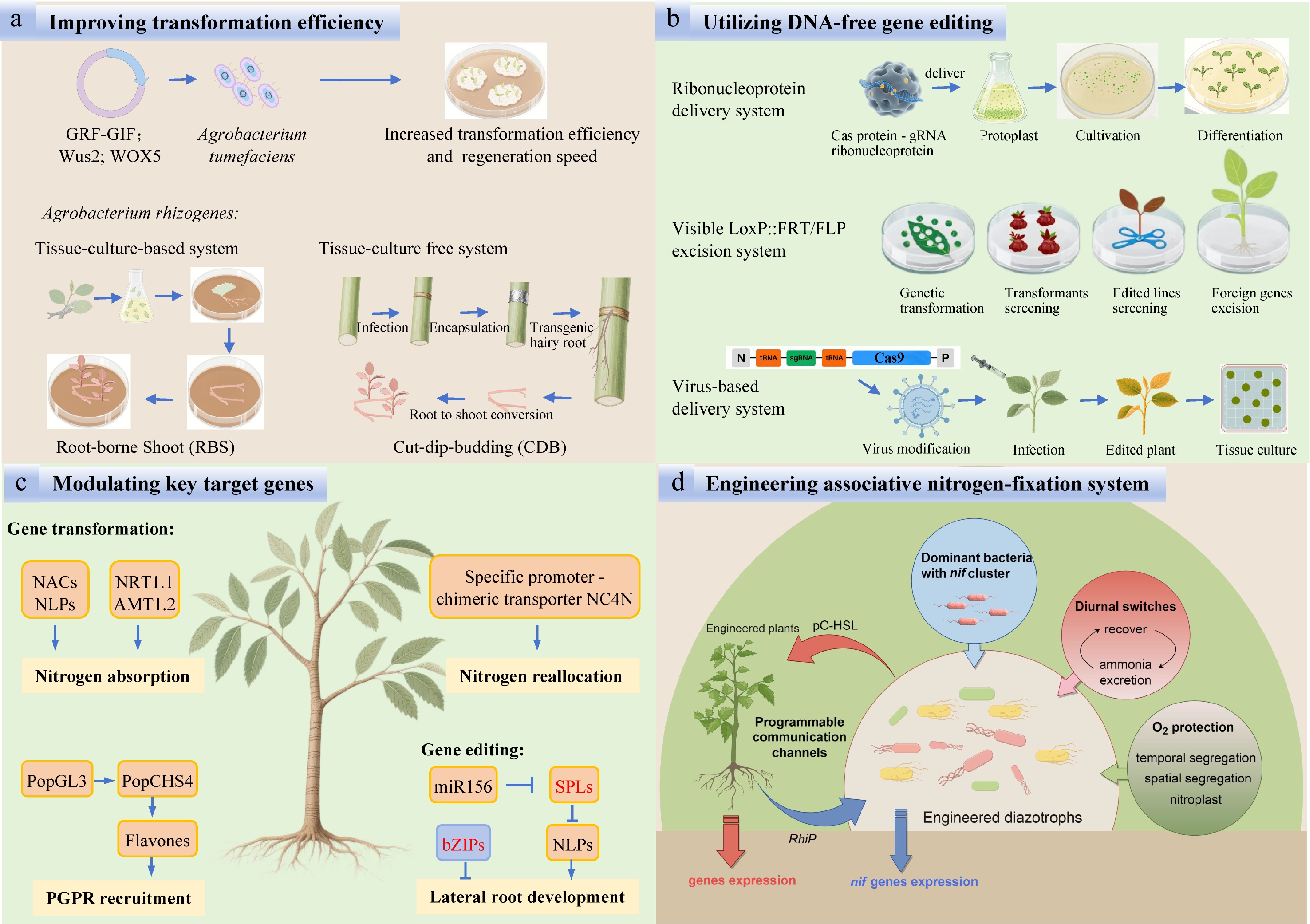 Challenges and measures for improving NUE in forest plantations. (a) Improving transformation efficiency. (b) Utilizing DNA-free gene editing. (c) Modulating key target genes. (d) Engineering associative nitrogen-fixation system.