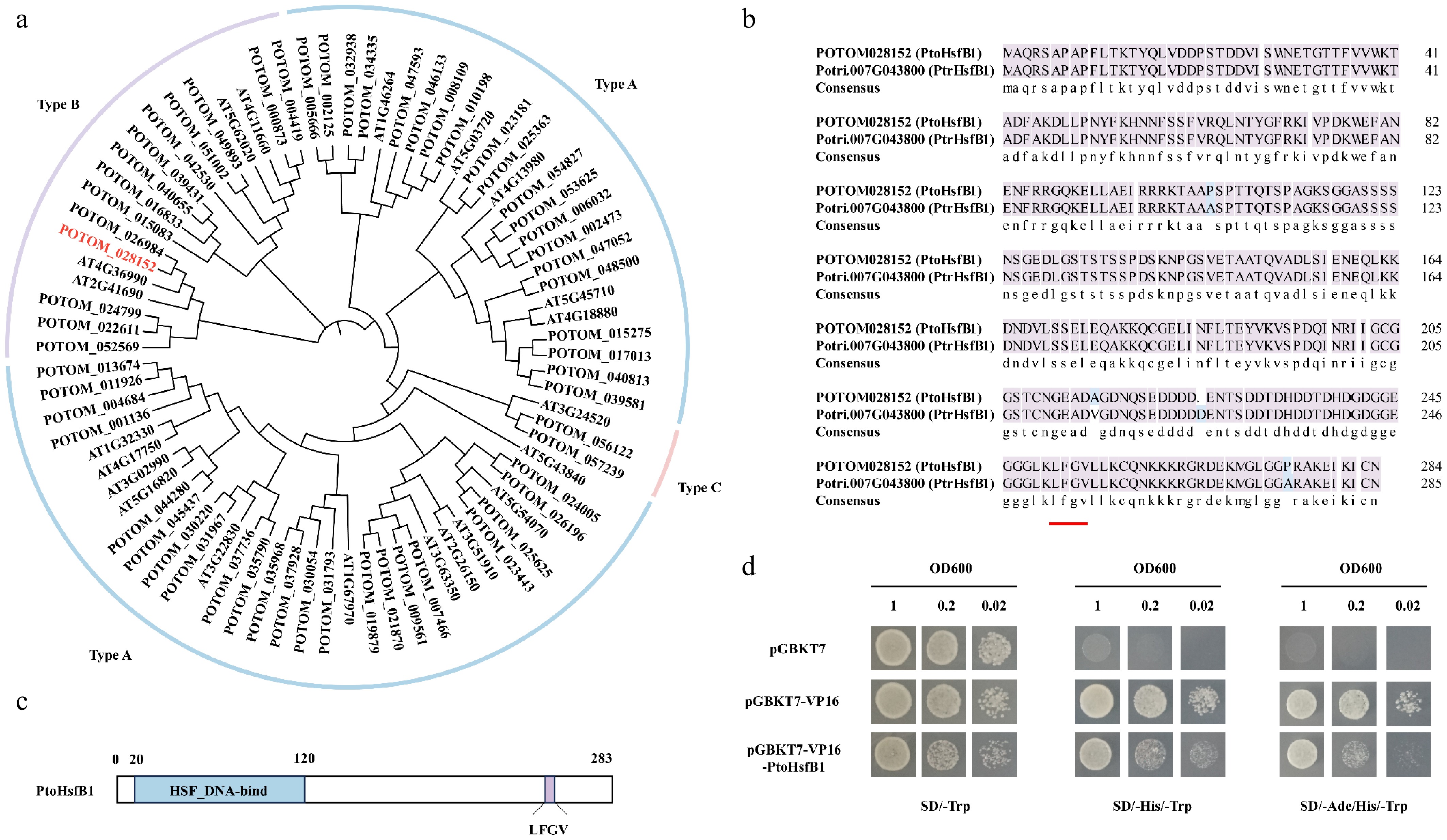 The protein sequence analysis of PtoHsfB1 in P. tomentosa. (a) A NJ phylogenetic tree of Hsfs from A. thaliana and P. tomentosa was generated. The line colors blue, purple, and pink represent subgroups A, B, and C, respectively. (b) Comparison of the protein sequence of PtoHsfB1 and PtrHsfB1. The red underlined part represents the core tetrapeptide of the subgroup B transcriptional repressor Hsf. (c)The protein structure of PtoHsfB1. The blue part represents the Hsf DNA binding domain, and the purple part represents the core tetrapeptide 'LFGV' of the repressor domain. (d) Yeast transcriptional activation assay for PtoHsfB1 (negative control: pGBKT7; positive control: pGBKT7-VP16).