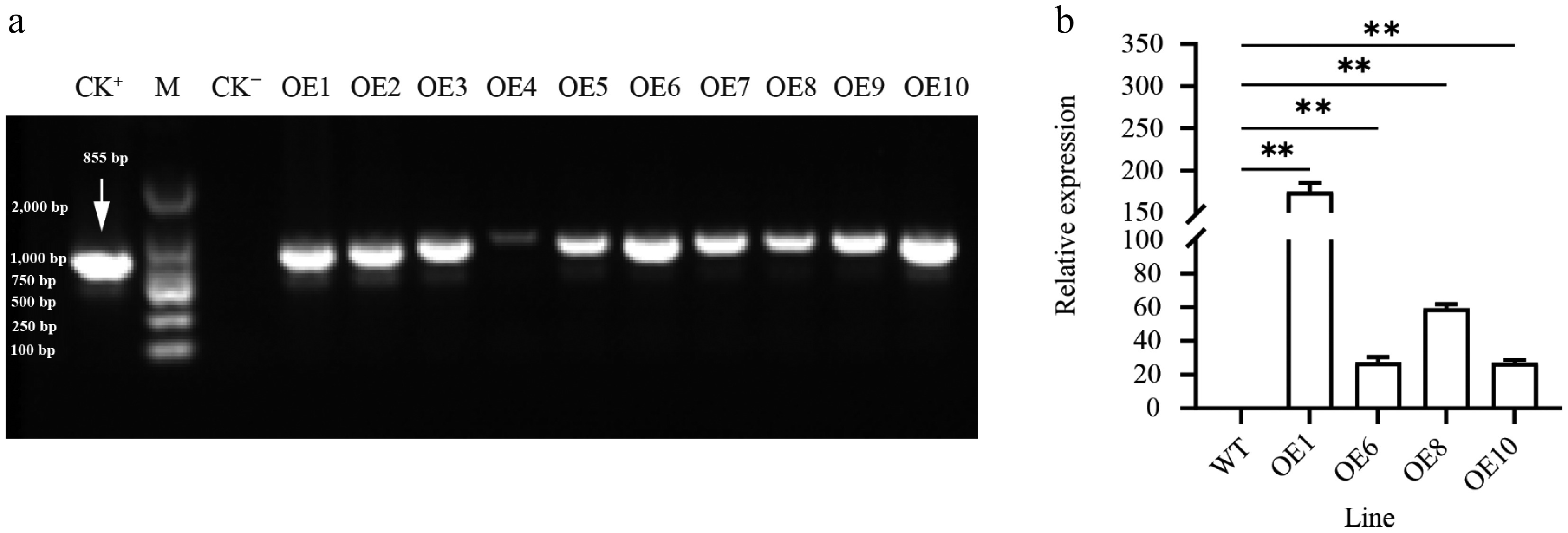 Expression of PtoHsfB1 in leaves of plantlets. (a) PCR amplification of PtoHsfB1 from WT and different transgenic lines. CK+: Plasmid pBI121-PtoHsfB1, M: DL2000 DNA marker, CK: untransformed line. (b) Relative quantification of RNA in transgenic plants and WT plants.