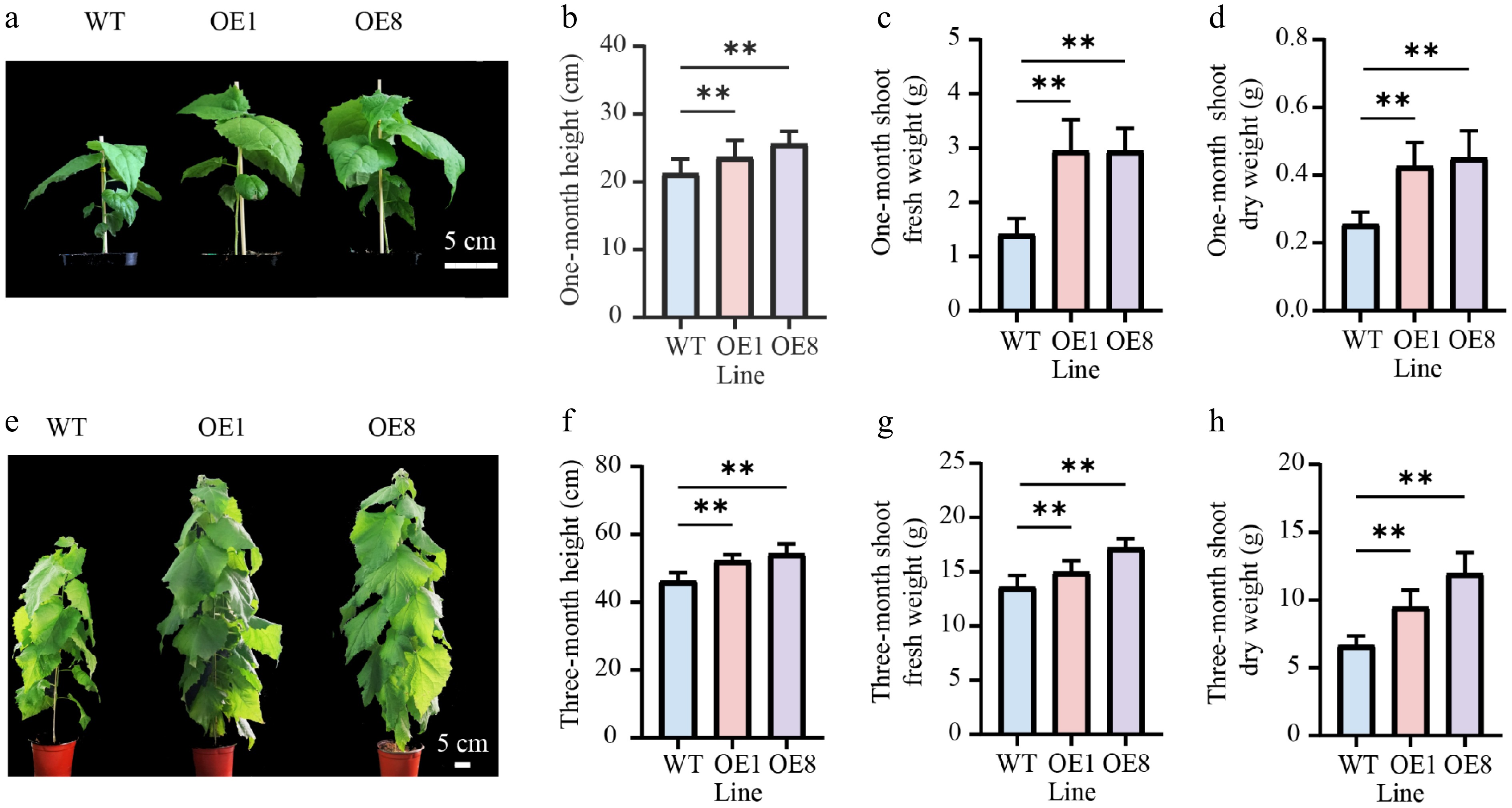 • To determine whether PtoHsfB1 regulates shoot growth, we compared the shoot phenotype of one-month-old plantlets (Fig. 3a). Phenotypic analysis suggested that the OE lines were significantly taller than the WT (Fig. 3a). The average heights of OE1 and OE8 exceeded those of the WT by 9.17% and 18.35%, respectively (Fig. 3b). Moreover, OE lines produced more leaves and accumulated over twice the shoot biomass of the WT (Fig. 3c and Supplementary Fig. S1). Consistent with the fresh weight measurements, the shoot dry weight was also significantly higher in the OE lines. The shoot dry matter content (dry weight as a percentage of fresh weight) was 81.9% in the WT and at least 84.6% in the OE (Fig. 3c, d). Furthermore, these lines accumulated approximately 1.7 to 1.8 times the shoot dry weight of the WT (Fig. 3c, d). To determine whether the enhanced shoot growth was sustained, we measured the shoot growth metrics of three-month-old plantlets transplanted to the greenhouse using the same methodology as for the one-month-old plantlets. After three months of growth, the growth rate of OE1 and OE8 remained considerably higher than that of WT plants (Fig. 3e). Specifically, the average heights of OE1 and OE8 were 11.3% and 16.2% taller than those of the WT, respectively (Fig. 3f). After three months of growth, OE lines produced more leaves than the WT (Fig. 3e). Their shoot fresh and dry weights were also significantly greater (Fig. 3g, h). The shoot fresh weight in OE1 was 14.97 g, which indicates a 10% increase over the WT, whereas OE8 had a fresh weight of 17.20 g, representing a 26.5% increase relative to the WT (Fig. 3g). Additionally, the shoot dry weights of OE1 and OE8 were 1.5 and 1.8 times greater than that of the WT, respectively (Fig. 3h).