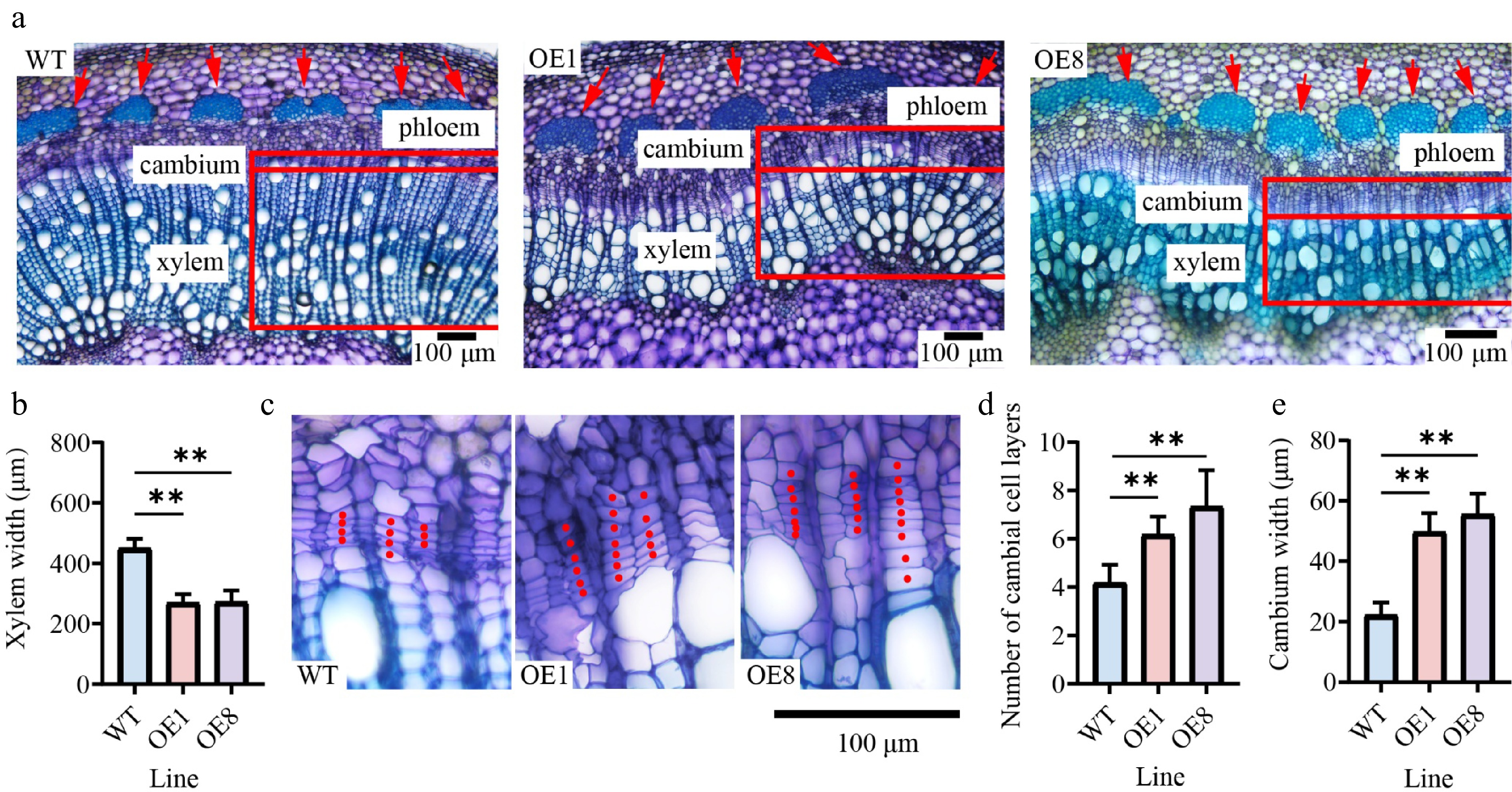 • Since the stems of three-month-old transgenic seedlings were significantly thicker than those of WT plants, we performed tissue section analysis on three-month-old seedlings cultivated in the greenhouse (Supplementary Fig. S2). Cytological analysis of stem cross-sections from the 10th internodes revealed anatomical differences. In OE stems, the phloem cap was more prominent, causing increased cell wall thickness in the phloem fiber cells (Fig. 4a). However, compared with the WT, the xylem widths of the 10th internode in the OE were significantly reduced, indicating that xylem development was suppressed (Fig. 4a). The xylem width of the WT (449.9 μm) was 1.7 times that of OE1, and 1.6 times that of OE8 (Fig. 4b). To determine whether the reduced xylem resulted from changes in cambial activity, a comparison of the cambial zones found that the OE lines had roughly twice as many cambial cell layers as the WT (Fig. 4c, d). The cambium widths of OE1 and OE8 were 2.2 and 2.5 times those of the WT, respectively (Fig. 4e).
