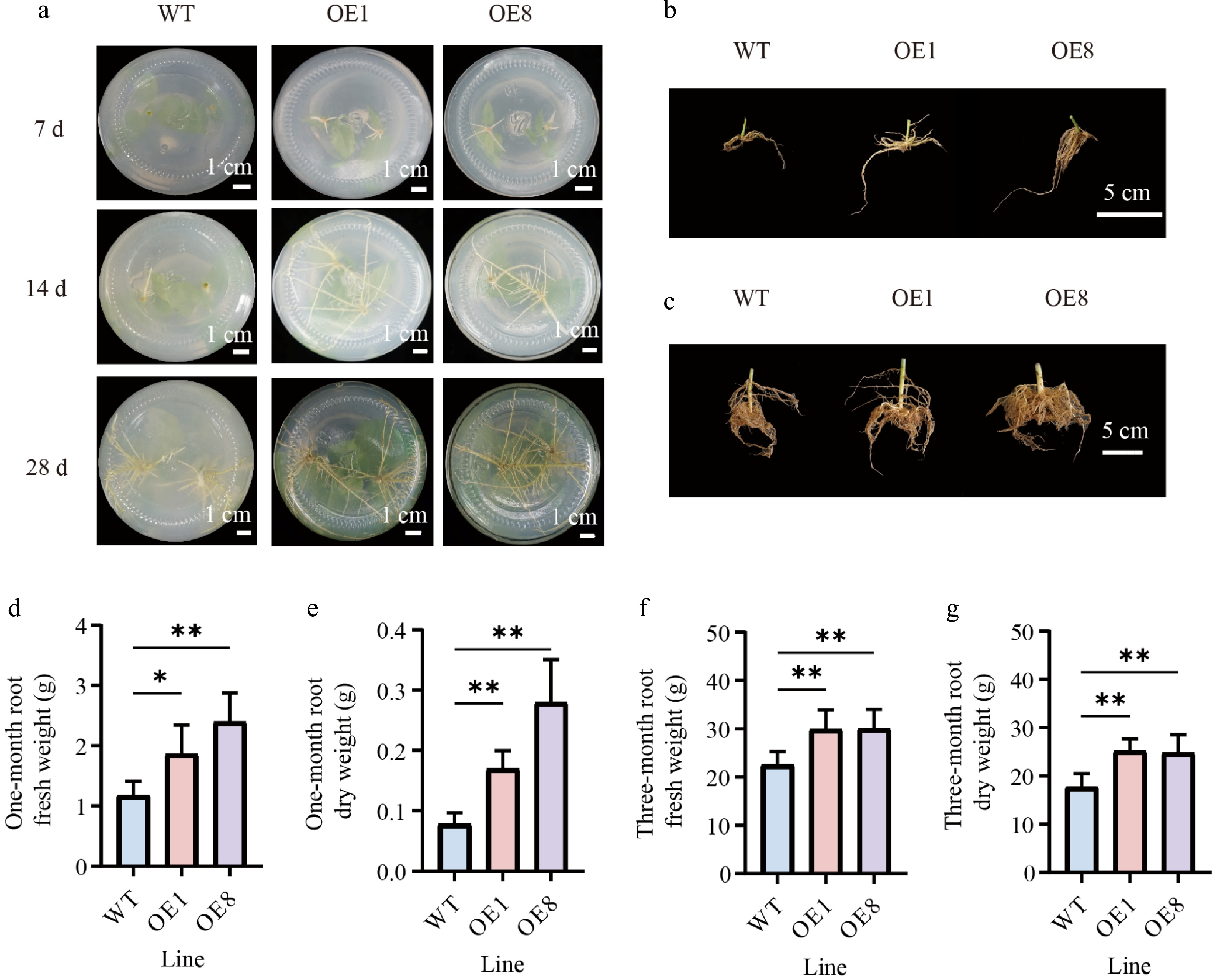In one-month-old plantlets, the OE plants exhibited significantly more roots and higher fresh weight than the WT plants (Fig. 5b, d). The root fresh weights of OE1 and OE8 exceeded those of the WT by 58.97% and 105.13%, respectively (Fig. 5d). The dry matter content of roots was significantly higher in OE plants. The root dry weights of OE1 and OE8 were 2.2 and 3.6 times those of the WT, respectively (Fig. 5e). In the three-month-old plantlets, the root biomass of the OE plants was also significantly greater than that of the WT (Fig. 5f, g). The root fresh weights of the OE plants increased by 27.7% relative to the WT plants (Fig. 5f), and their root dry weights were 1.4 times those of the WT (Fig. 5g). In summary, root biomass (both fresh and dry weight) was significantly higher in the OE than in the WT (Fig. 5).