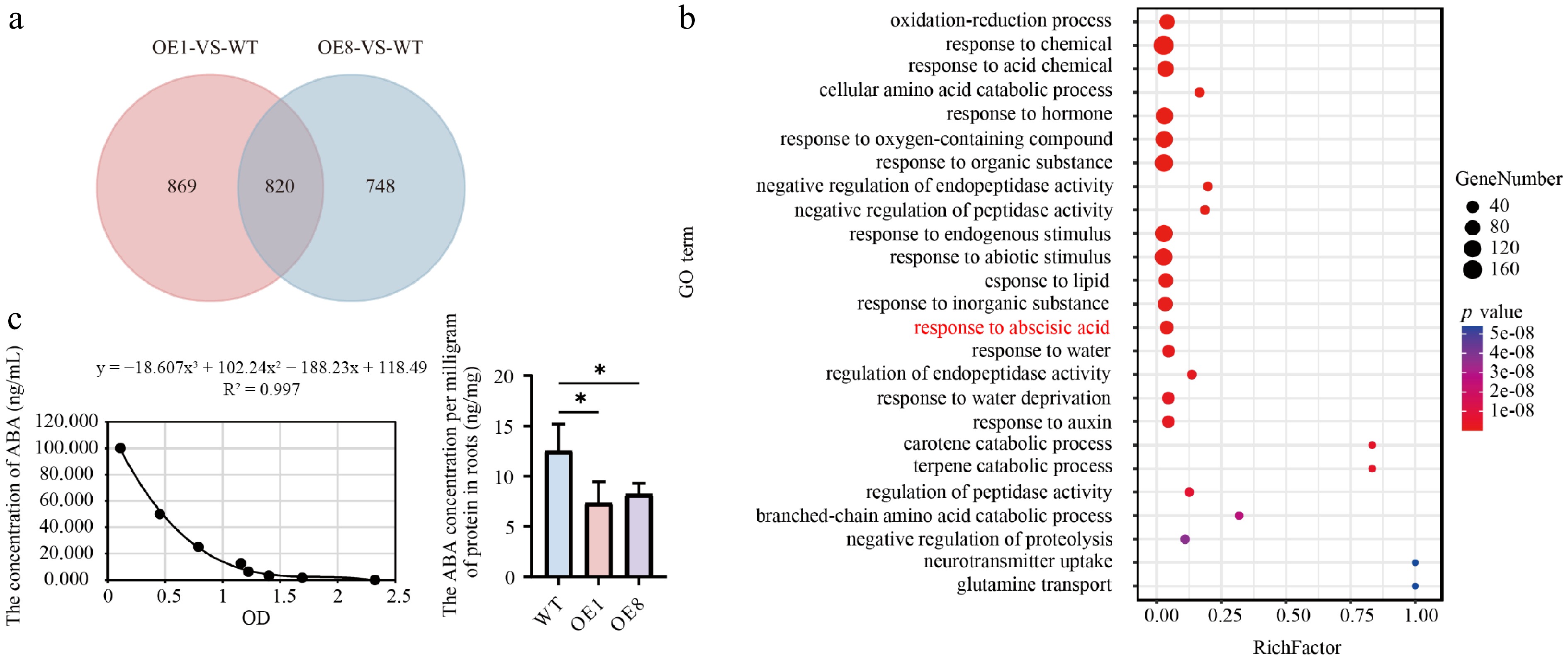 Transcriptome analysis and ABA content detection. (a) Venn diagram analysis of the OE1-VS-WT and OE8-VS-WT comparative groupings. (b) GO enrichment analysis of 820 DEGs depicts dots where their sizes reflect the number of enriched genes. Larger dots indicate a higher gene count. The color of the dots reflects the significance level of the enrichment; dots with a redder hue correspond to smaller Q values, indicating greater significance in the enrichment degree. (c) Left shows the ABA standard curve. The fitting method is polynomial, and the fitting equation is y = −18.607x3 + 102.24x2 − 188.23x + 118.49, R2 = 0.997, right shows ABA content in root tissues.