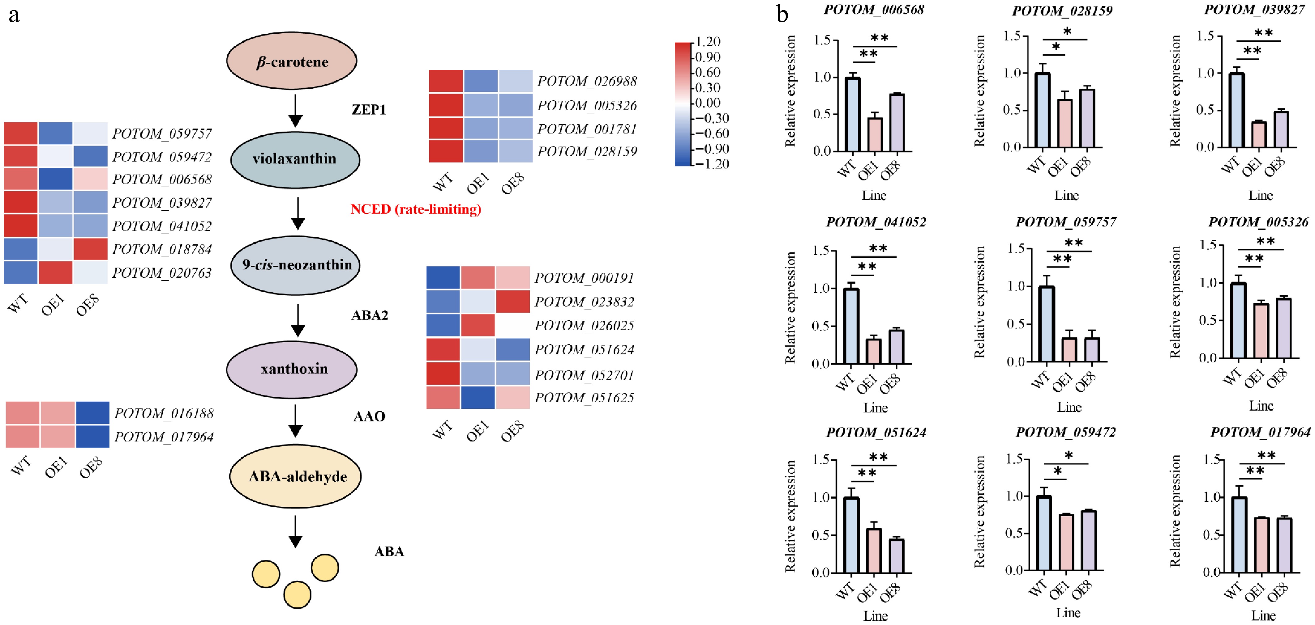 PtoHsfB1 overexpressing represses ABA biosynthesis. (a) Gene expression is presented in the heatmap. Red and blue represent higher and lower gene expression levels. (b) The relative expression of nine selected ABA biosynthesis related genes.