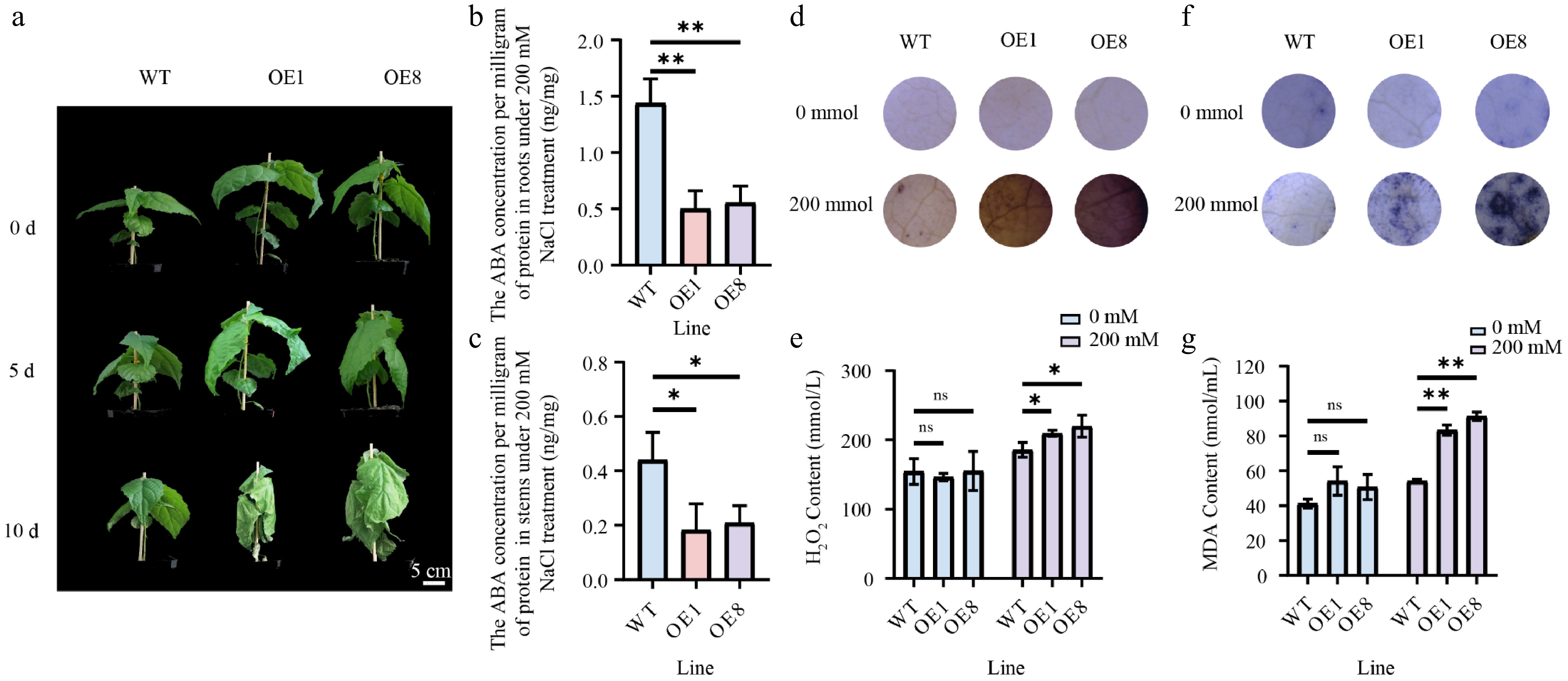 • ABA functions as a critical regulator of plant salt stress responses[42]. In this study, the overexpression of PtoHsfB1 reduced ABA levels (Fig. 6c, Supplementary Fig. S5). Furthermore, transcriptome data from previous studies revealed that PtoHsfB1 is significantly responsive to salt stress[43]. To verify this observation, RT-qPCR analyses were conducted on various tissues of P. tomentosa subjected to salt stress over different time periods. These results provided preliminary evidence confirming the significant responsiveness of PtoHsfB1 to salt stress (Supplementary Fig. S6). Therefore, we then examined the salt tolerance of the transgenic poplars. Under non-salt treatment, there were no noticeable phenotypic differences between OE and WT plants. However, after 5 d of treatment with 200 mM NaCl, the number of leaves in the transgenic lines decreased sharply. After 10 d of salt treatment, the leaves of transgenic lines were severely shriveled, and the shoot tips had dried up, whereas the WT leaves showed only slight drooping (Fig. 8a). Furthermore, ABA levels were measured in the root and stem tissues after the treatment with 200 mM NaCl. The findings demonstrated that ABA levels in the OE1 and OE8 lines were significantly lower than in the WT (Fig. 8b, c). We used DAB and NBT histochemical staining to measure changes in H2O2 and O2 concentration in order to gauge the degree of oxidative stress. Under non-salt conditions, DAB staining showed no differences between OE and WT plants. However, after salt treatment, the leaf discs from the transgenic lines exhibited more intense staining than those from the WT (Fig. 8d). Consistent with the DAB staining results, H2O2 content detection revealed that the OE plants had significantly greater H2O2 levels than the WT plants following salt treatment, but no significant difference was observed under non-salt circumstances (Fig. 8e). NBT staining revealed that leaf discs from OE plants turned a darker purple than WT plants after salt treatment, indicating higher O2 levels in OE plants (Fig. 8f). MDA, a well-known indicator of oxidative stress and lipid peroxidation[44], was also measured to assess the effect of salt stress on cell membrane permeability. Under non-salt treatment, OE and WT plants showed no significant difference in MDA content. However, during salt stress, the MDA levels in OE plants were significantly higher than those in WT plants (Fig. 8g).