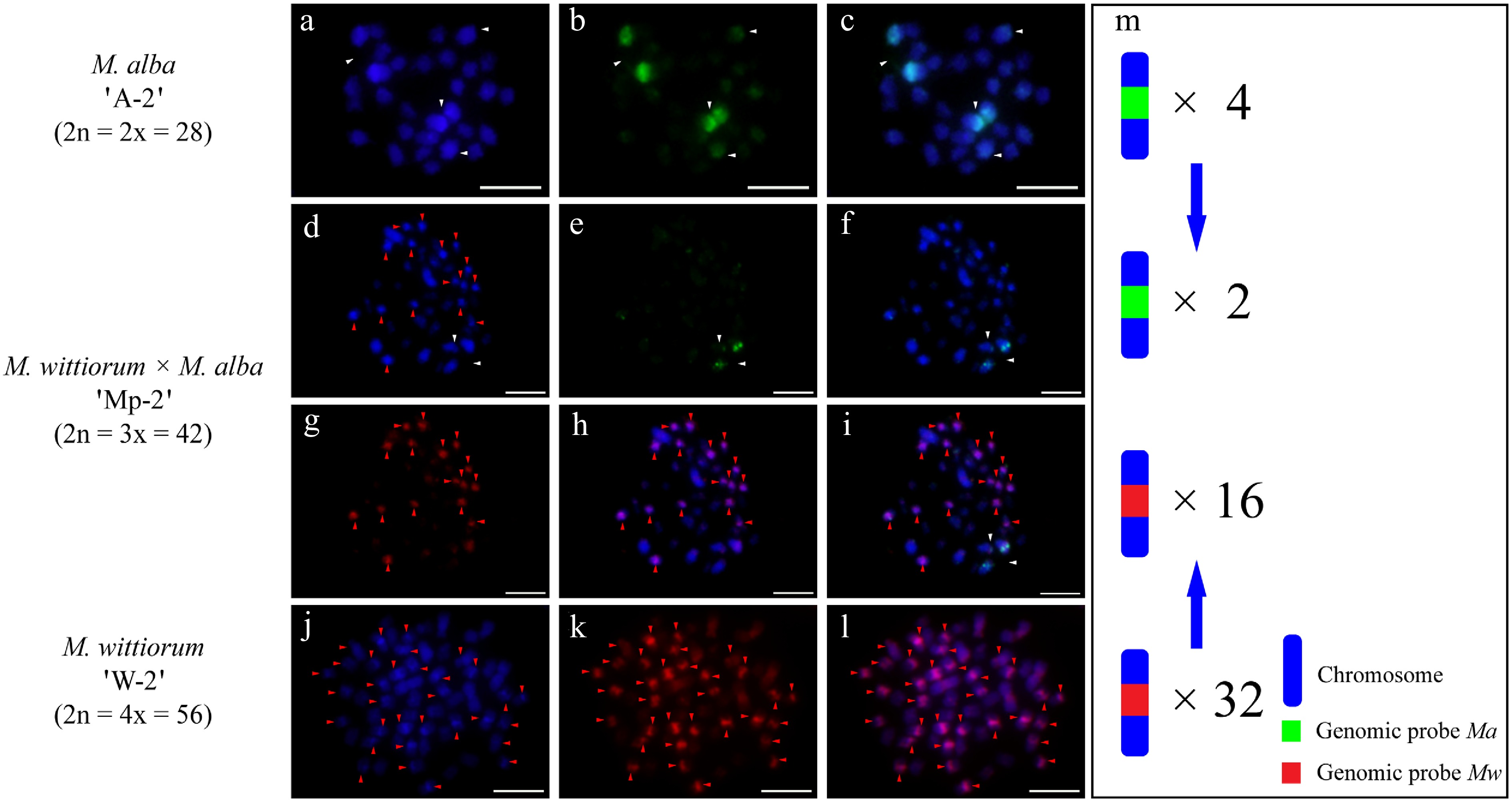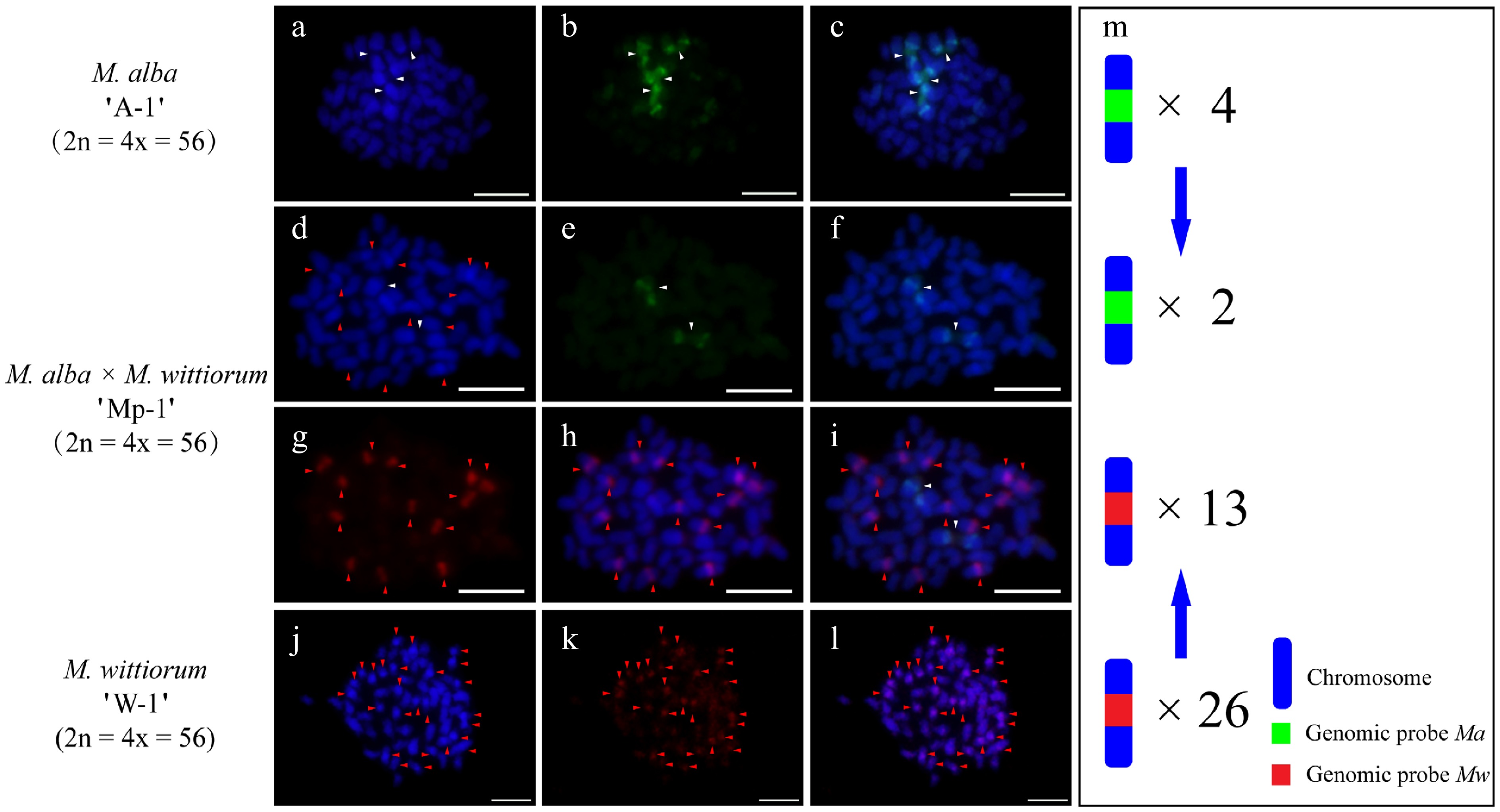 cGISH signal patterns in M. alba 'A-2', M. wittiorum 'W-2', and their hybrid M. wittiorum × M. alba 'Mp-2'. cGISH signals using the genomic probe from Ma (green) with blocking DNA from Mw were detected in (a)−(c) M. alba 'A-2' and (d)−(f) the hybrid 'Mp-2'. cGISH signals using the genomic probe from Mw (red) with blocking DNA from Ma were detected in (g), (h) the hybrid 'Mp-2' and (j)−(l) M. wittiorum 'W-2'. (i) The two-round cGISH showing overlapping signals from Ma (green) and Mw (red) genomic probes with reciprocal blocking DNA. (m) Ideogram summarizing the chromosome counts with different genomic probes' signals. White and red arrows point to the chromosomes with Ma and Mw signals, respectively. Blue arrows indicate the transmission of parental chromosome to the hybrid. Scale bars represent 5 μm.