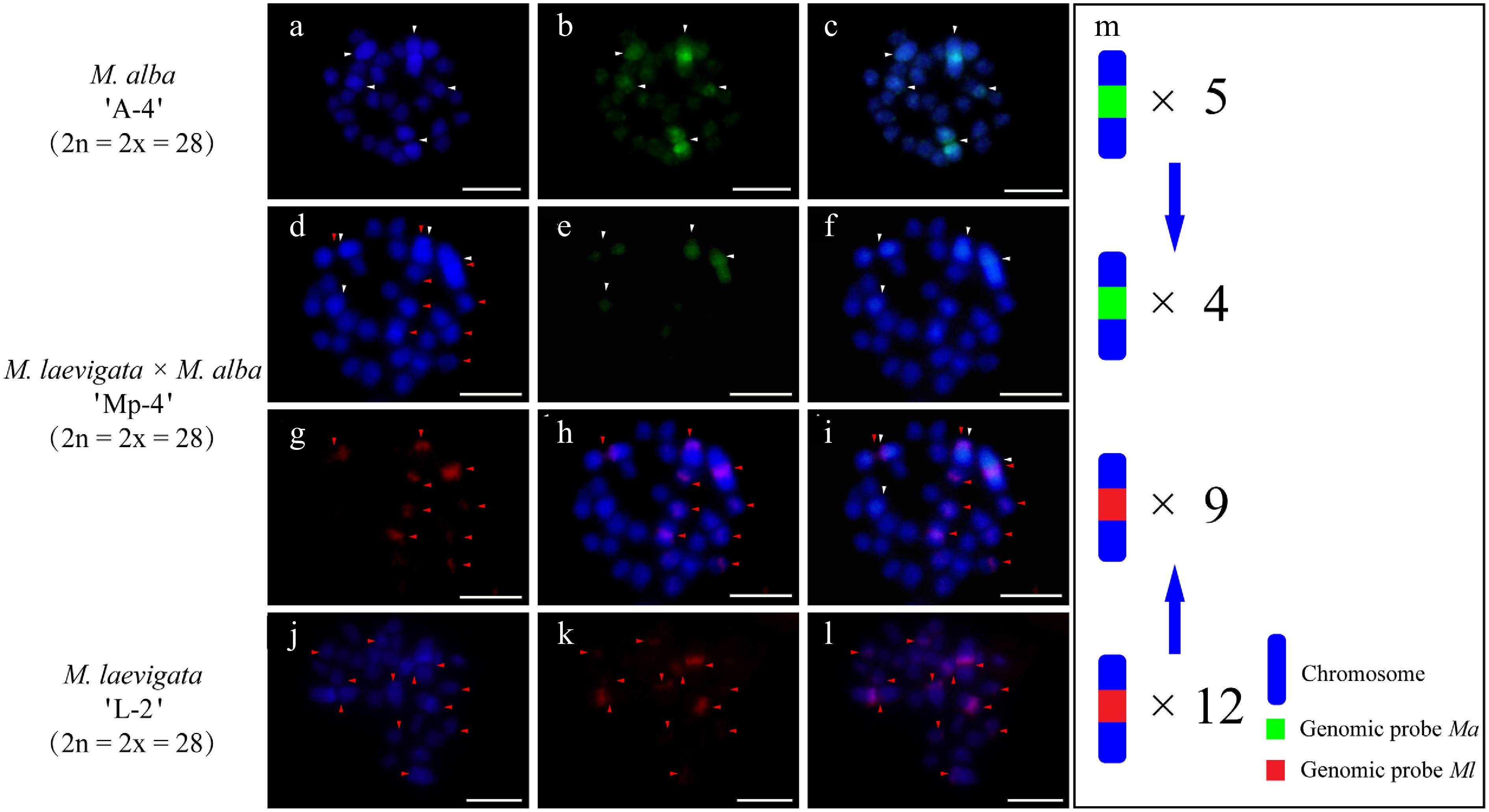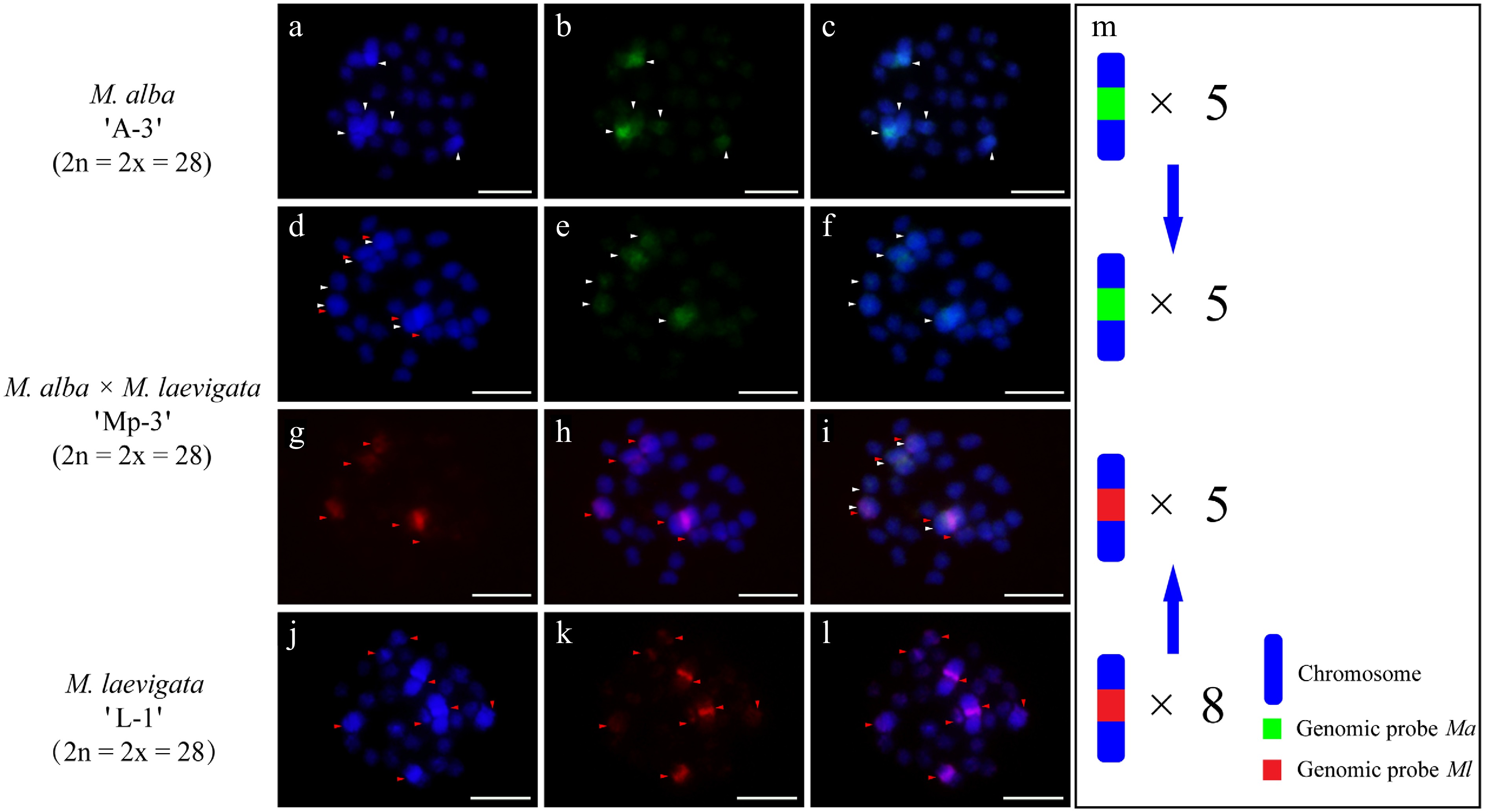 cGISH signal patterns in M. alba 'A-4', M. laevigata 'L-2', and their hybrid M. laevigata × M. alba 'Mp-4'. cGISH signals using the genomic probe from Ma (green) with blocking DNA from M. laevigata (Ml) were detected in (a)−(c) M. alba 'A-4' and (d)−(f) the hybrid 'Mp-4'. cGISH signals using the genomic probe from Ml (red) with blocking DNA from Ma were detected in (g), (h) the hybrid 'Mp-4' and (j)−(l) M. laevigata 'L-2'. (i) The two-round cGISH showing overlapping signals from the Ma (green) and Ml (red) genomic probes with reciprocal blocking DNA. (m) Ideogram summarizing chromosome counts with different genomic probes' signals. White and red arrows point to chromosomes with the Ma and Ml signals, respectively. Blue arrows indicate the transmission of parental chromosome to the hybrid. Scale bars represent 5 μm.