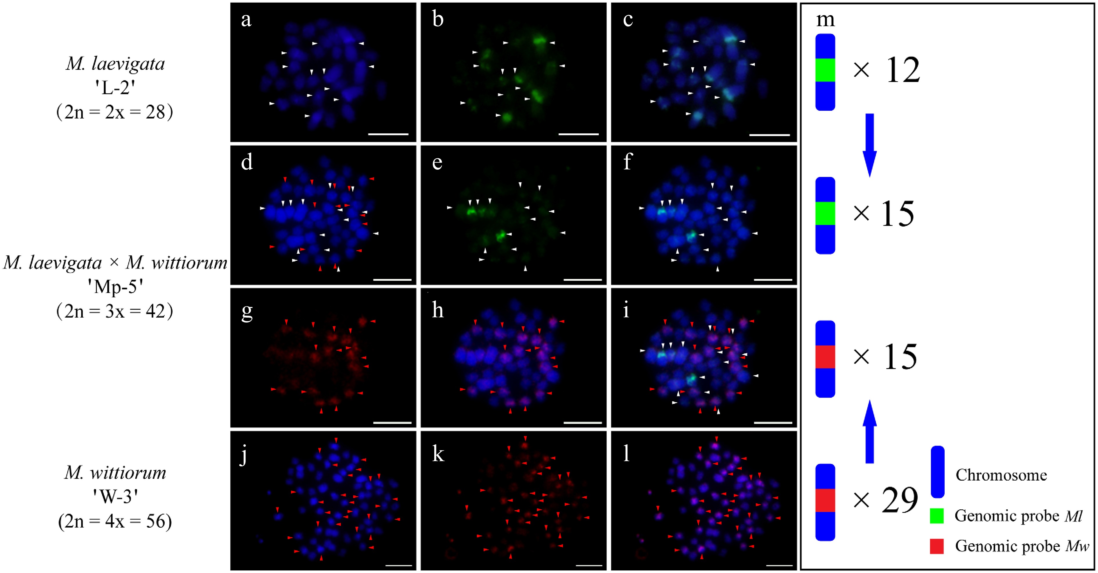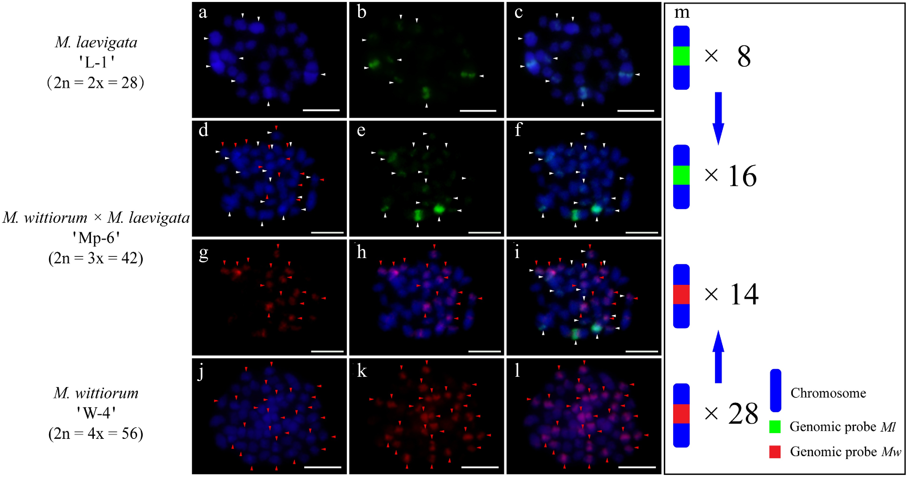 cGISH signal patterns in M. laevigata 'L-1', M. wittiorum 'W-4', and their hybrid M. wittiorum × M. laevigata 'Mp-6'. cGISH signals using the genomic probe from Ml (green) with blocking DNA from Mw were detected in (a)−(c) M. laevigata 'L-1' and (d)−(f) the hybrid 'Mp-6'. cGISH signals using the genomic probe from Mw (red) with blocking DNA from Ml were detected in (g), (h) the hybrid 'Mp-6', and (j)−(l) M. wittiorum 'W-4'. (i) The two-round cGISH showing overlapping signals from the Ml (green) and Mw (red) genomic probes with reciprocal blocking DNA. (m) Ideogram summarizing chromosome counts with different genomic probes' signals. White and red arrows point to the chromosomes with Ml and Mw signals, respectively. Blue arrows indicate the transmission of parental chromosomes to the hybrid. Scale bars represent 5 μm.