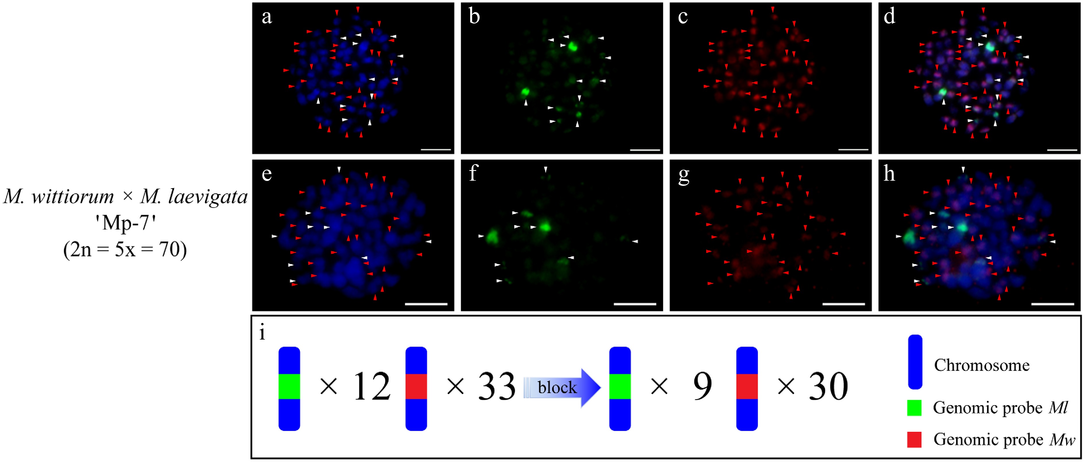 cGISH signal patterns in the hybrid 'Mp-7' from the cross M. wittiorum 'W-4' × M. laevigata 'L-1'. (a)−(d) Dual-color GISH signals using the genomic probes from Ml (green) and Mw (red) were detected in the hybrid 'Mp-7'. (e)−(h) The two-round cGISH signals using the genomic probes from Ml (green) and Mw (red) with reciprocal blocking DNA were detected in the hybrid 'Mp-7'. (i) Ideogram summarizing chromosome counts with different genomic probes' signals. White and red arrows point to chromosomes with the Ml and Mw signals, respectively. The blue gradient arrow indicates the changes in signal number after the application of blocking DNA. Scale bars represent 5 μm.